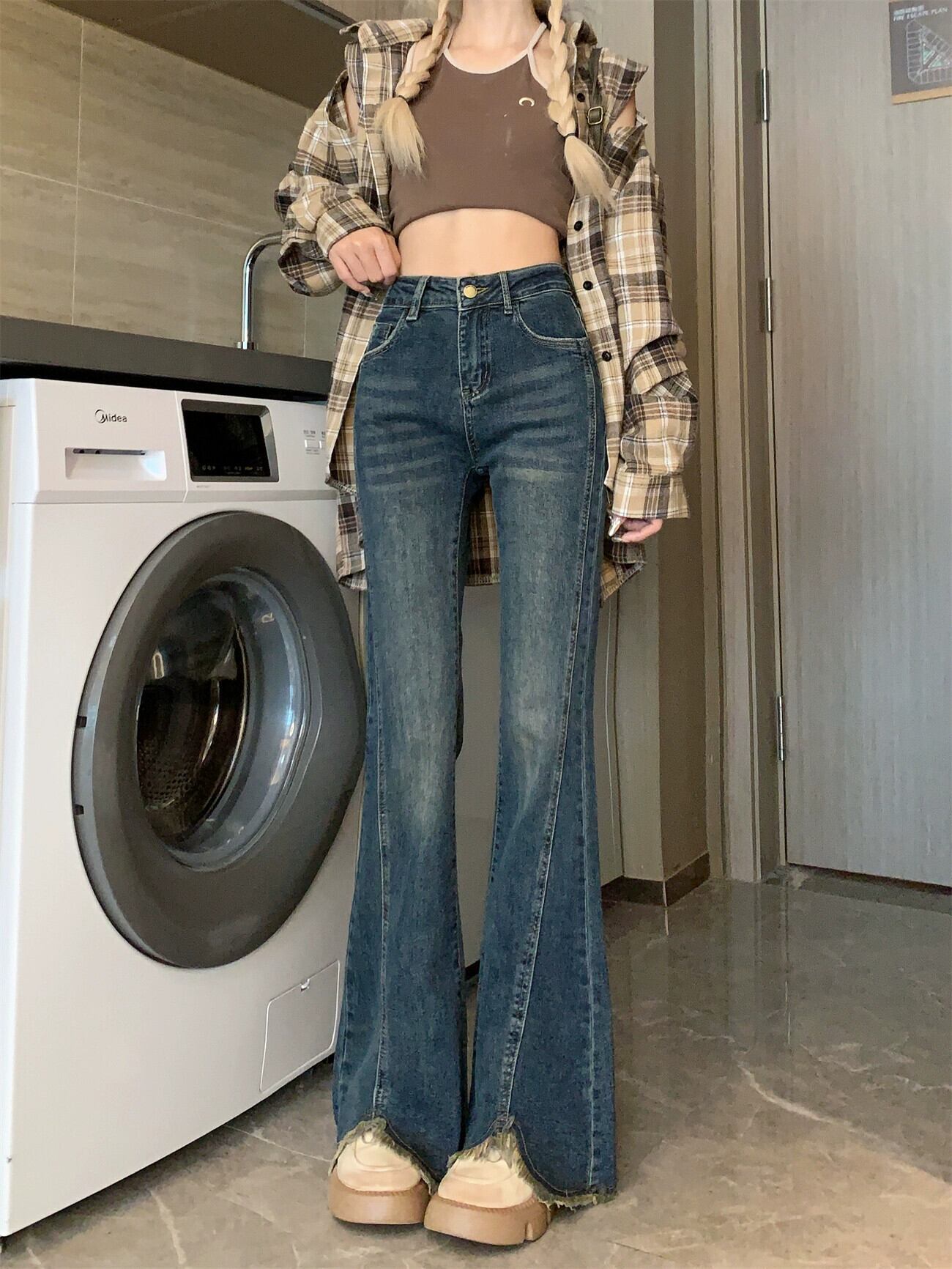 ローエッジスリットジーンズ女性秋ハイウエストスリムマイクロフレアパンツ 2024 新しい人気のレトロフロアレングスパンツ レッド オータム 秋物 8571688052775026