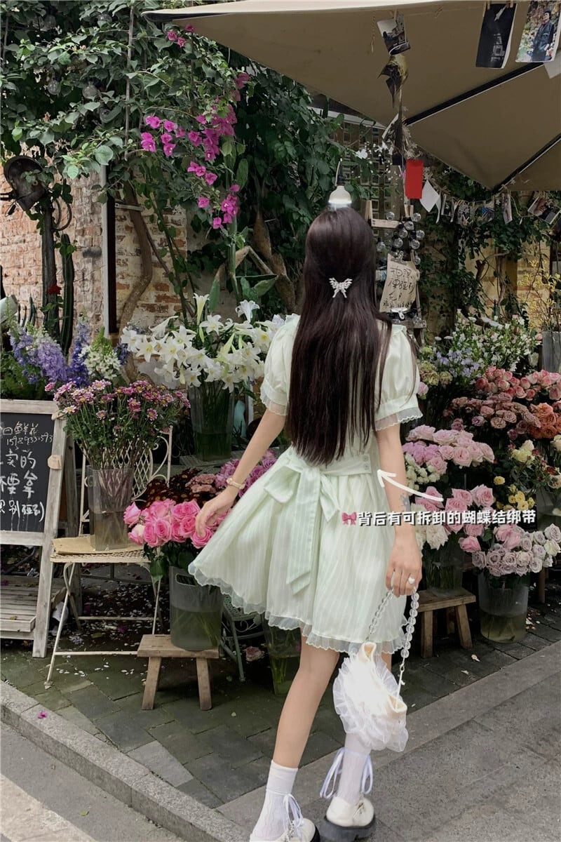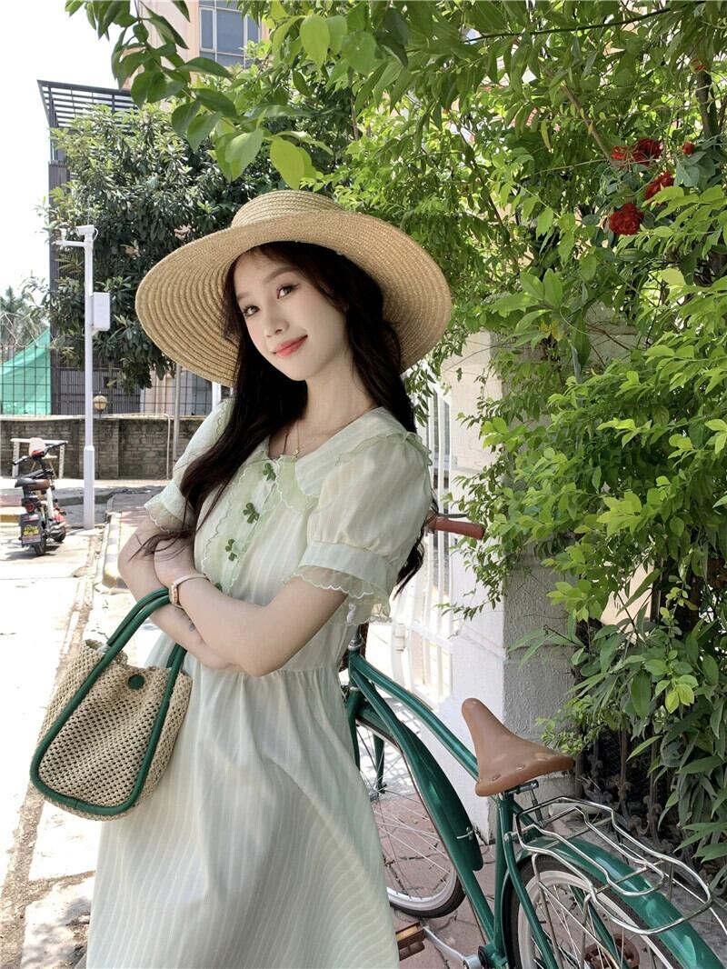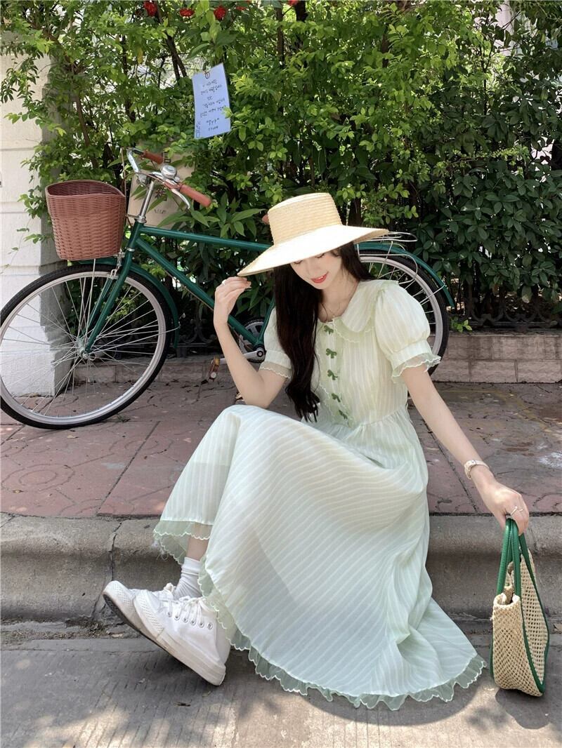ベビードール襟ストライプドレス女性の夏フレンチ初恋優しいスタイル美しい小さなパフスリーブロングスカート サマー 夏物 8571659944112499