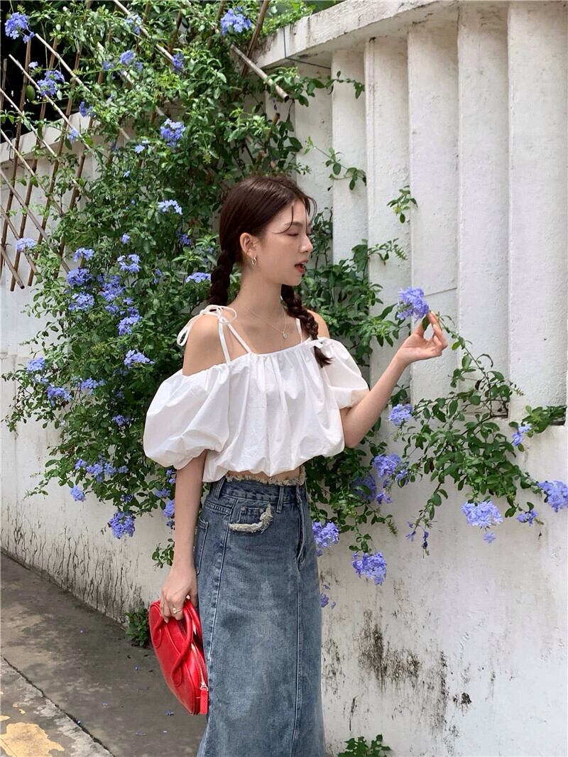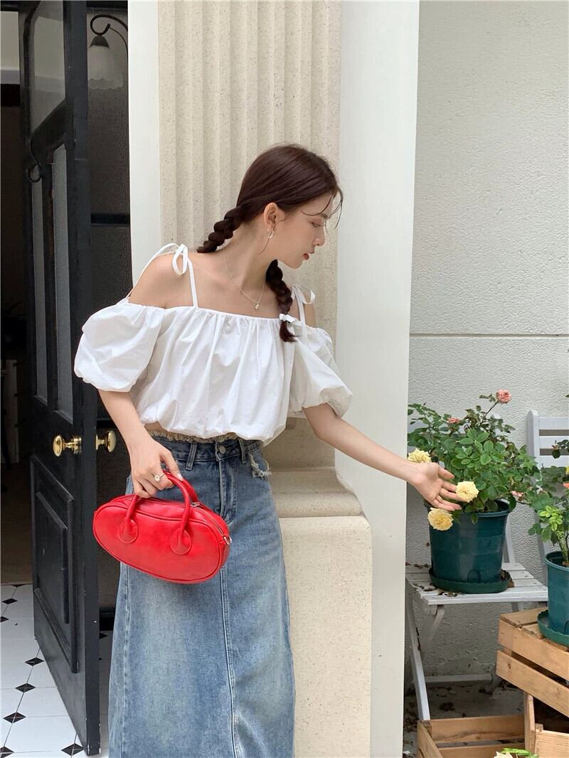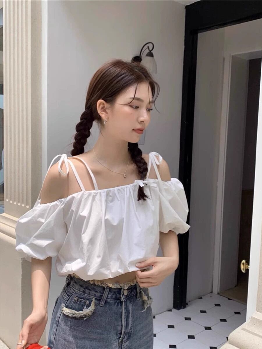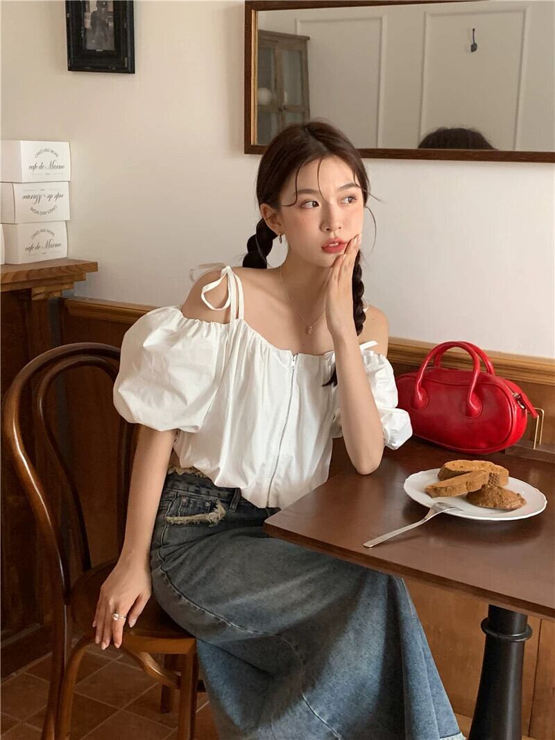 オフショルダー ワンショルダー サスペンダー クロップトップ レディース 夏 甘い 前後 2 着 ホワイト パフ スリーブ ジッパー シャツ 大人ガーリー スウィート キュート カジュアル サマー 夏物 8571627691079309