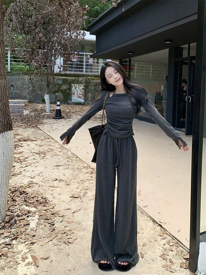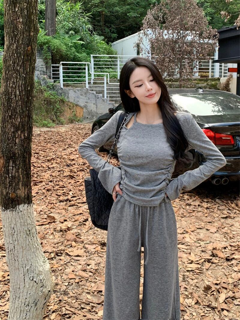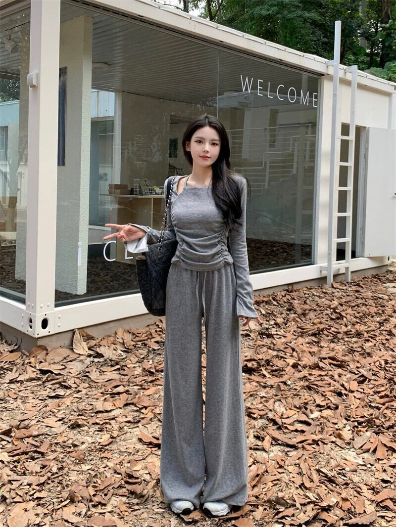 フェイクツーピースプリーツウエストトップスレディース、秋ボトムシャツ、寒くてシックでユニークな長袖Tシャツスーツ ロング オータム 秋物 8571669682962643