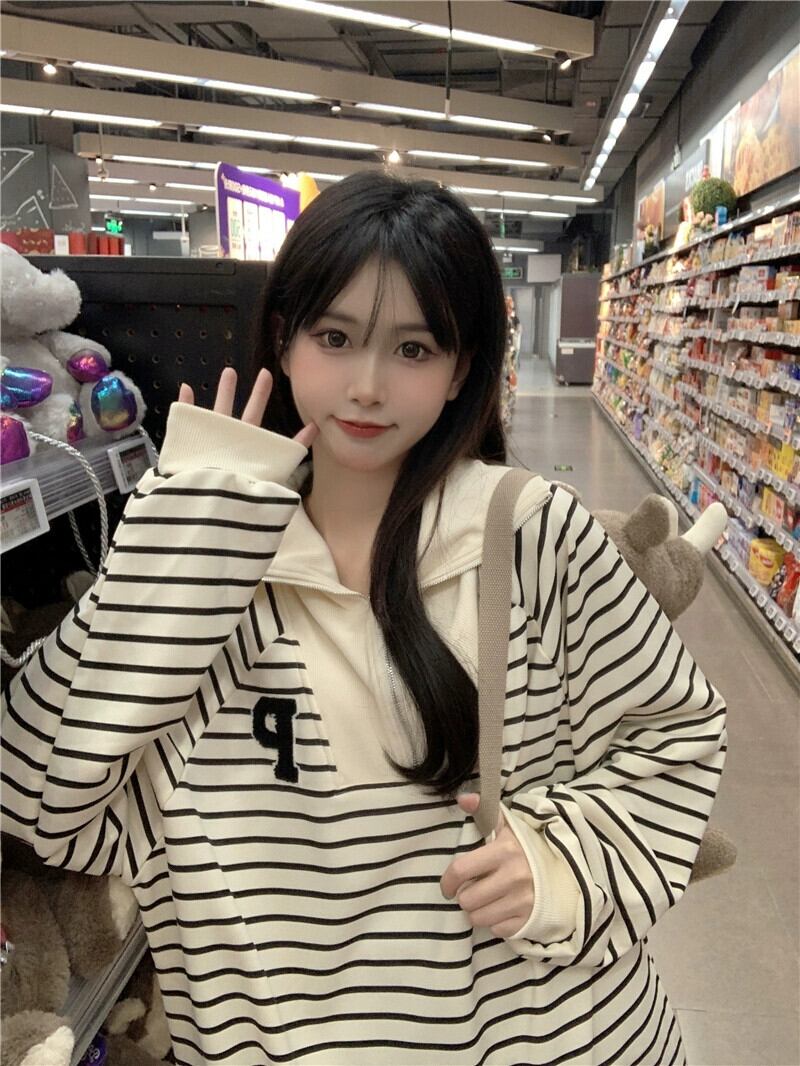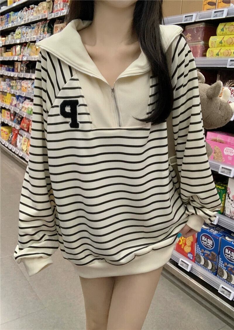 ハーフジップストライプスウェットシャツ女性ニッチデザイン2024新しい秋スタイル緩い怠惰なスタイルカジュアル長袖トップ ロング オータム 秋物 8571679844573266