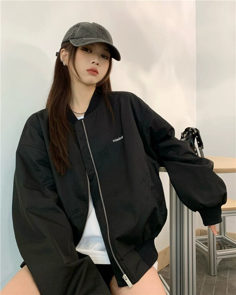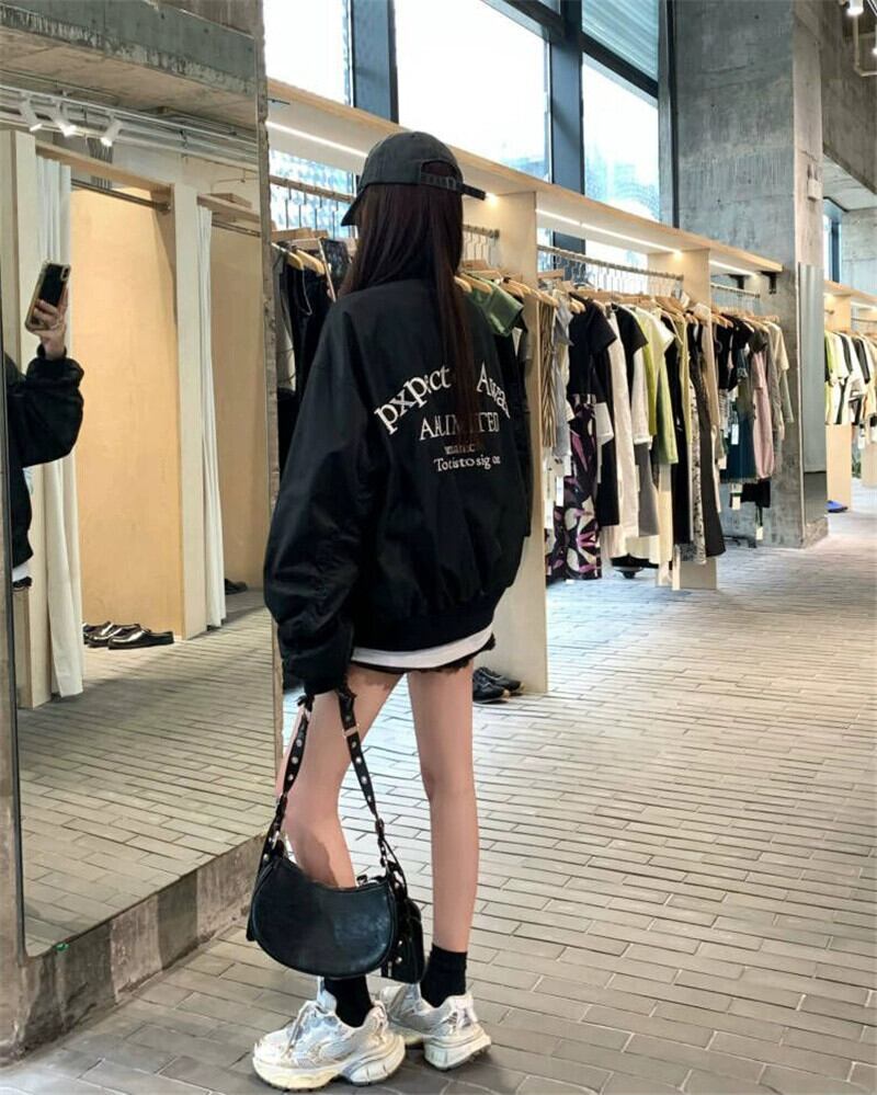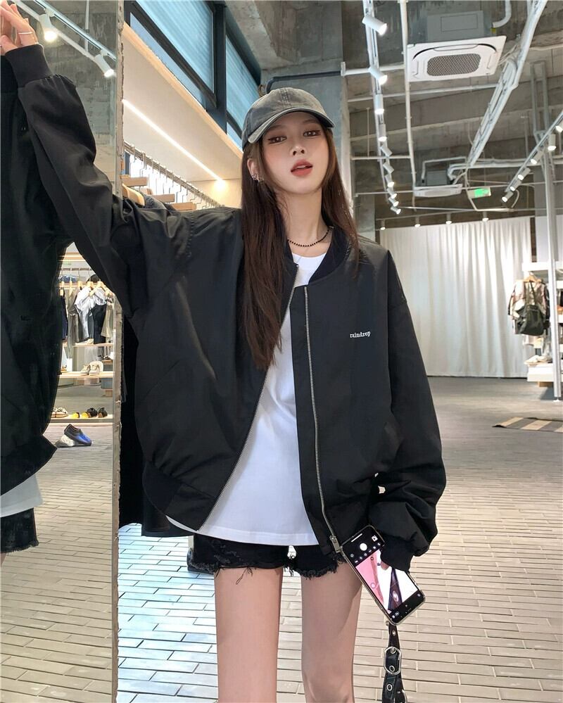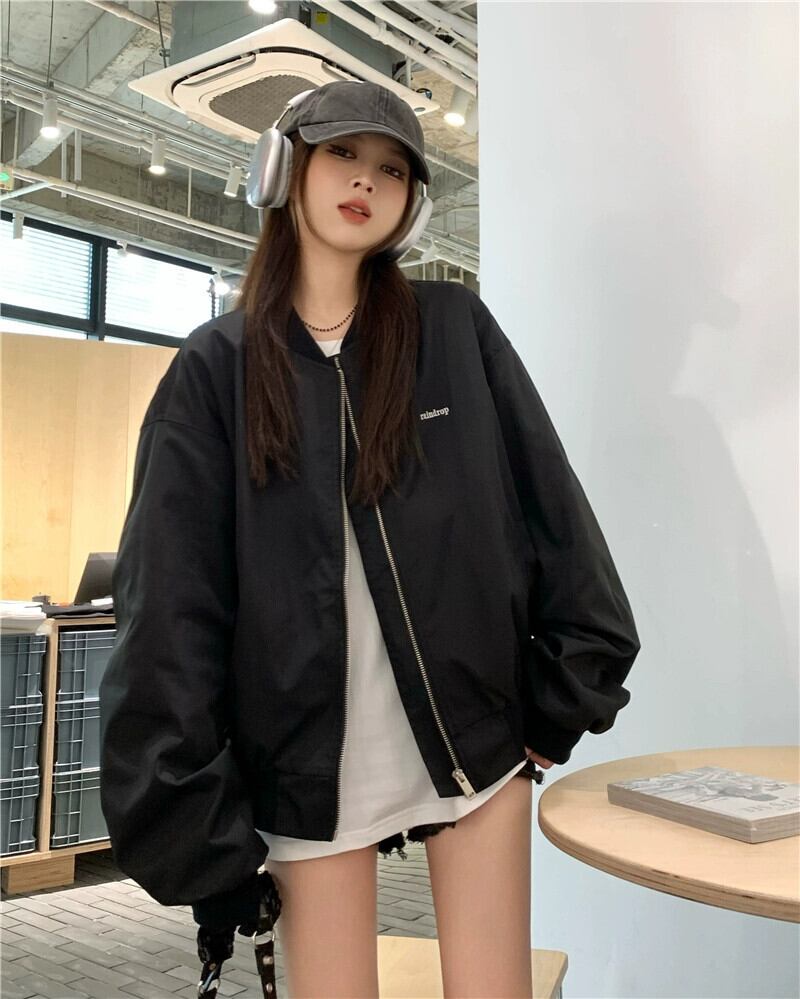 黒の野球ジャケットの女性の 2024 秋の新しいアメリカン レトロなトレンディなブランド ルーズ レイジー スタイル ジャケット トップ ブラック オータム 秋物 8571681215353218