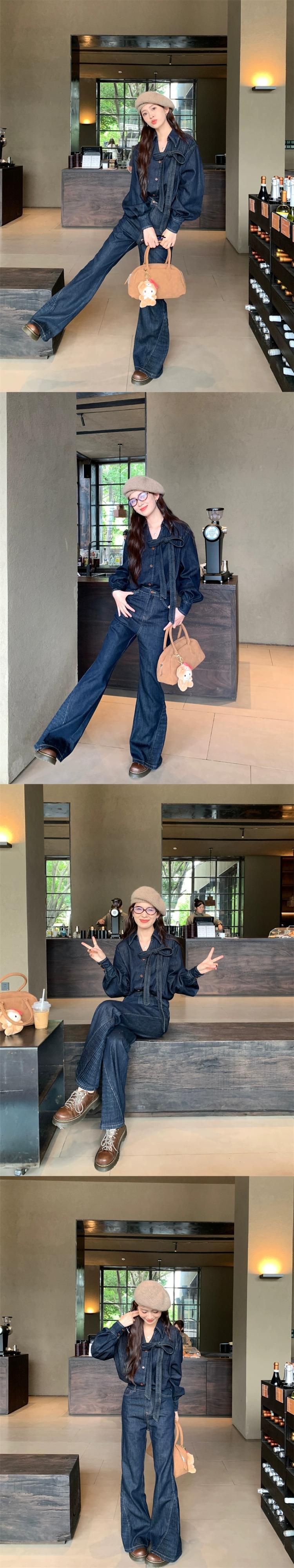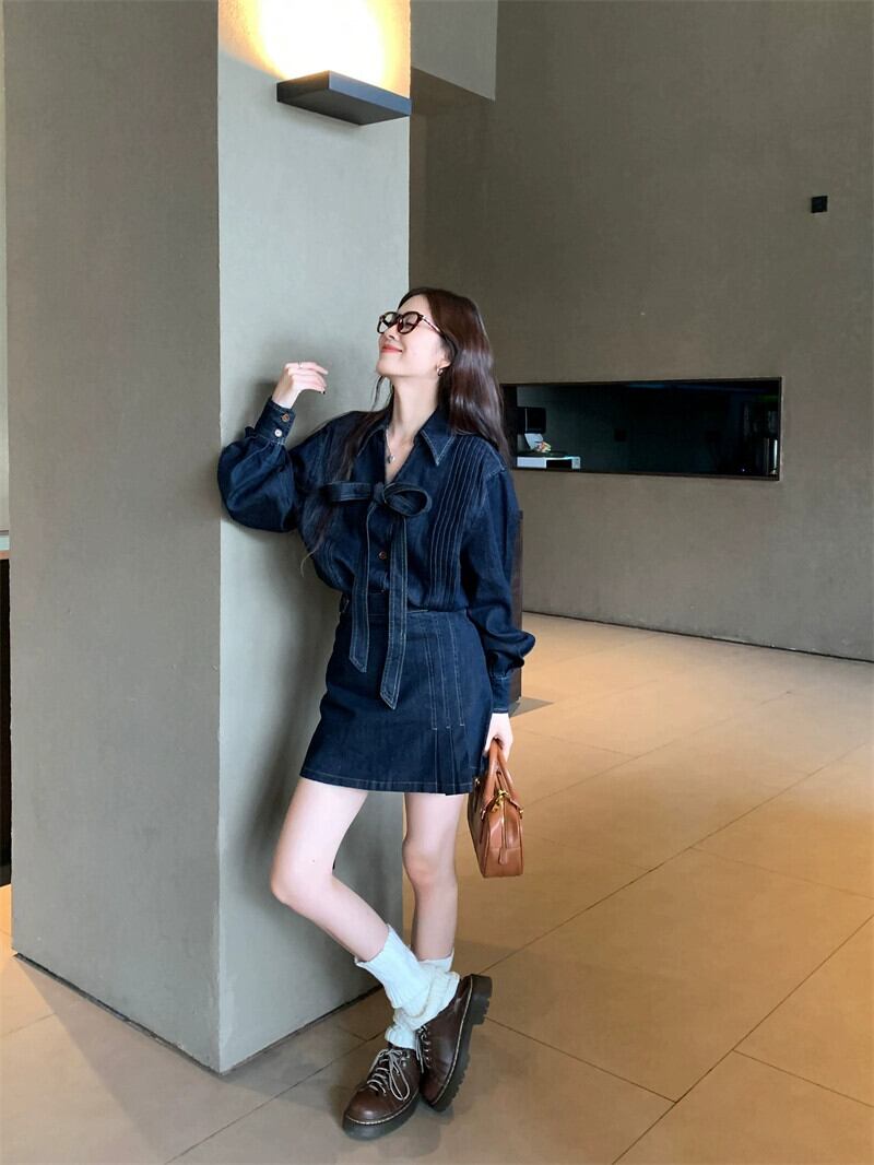 ダークブルーデニムシャツの女性の2024年秋冬の新しい香港スタイルのレトロな気質のハイエンドの弓長袖トップ ロング リボン オータム 秋物 ウィンター 冬物 8571667561488949