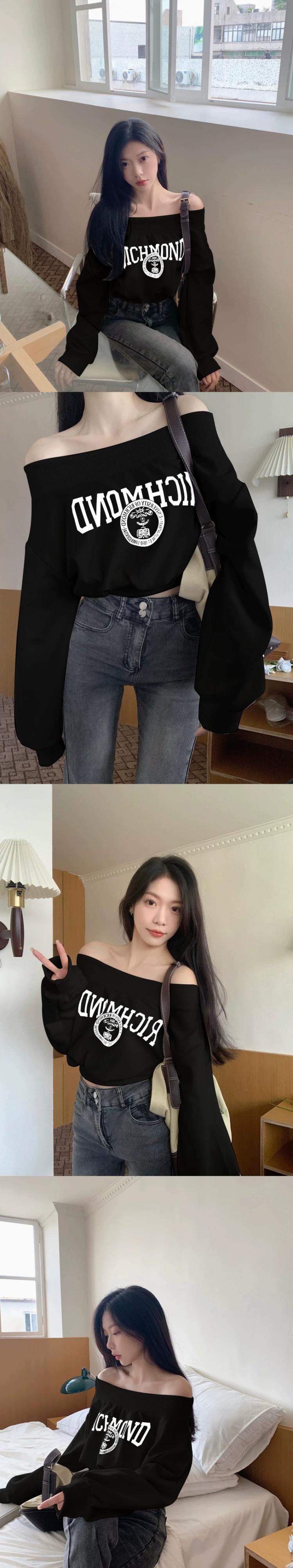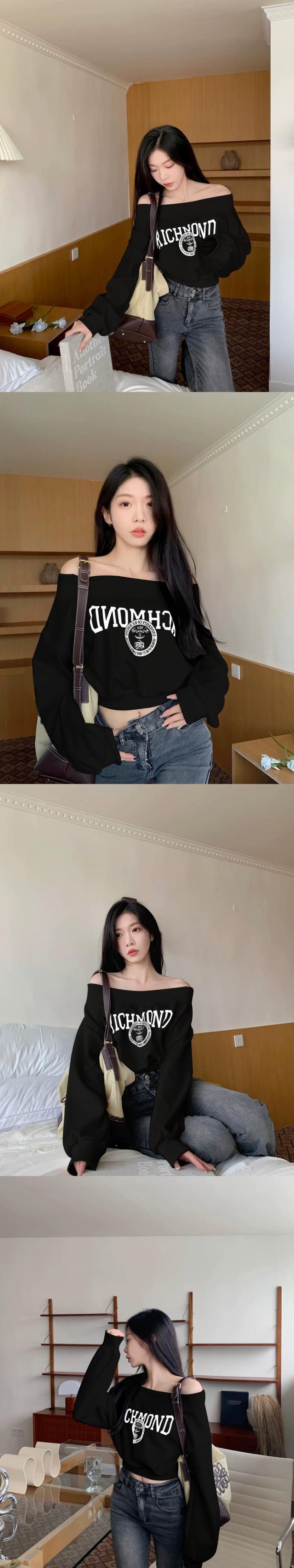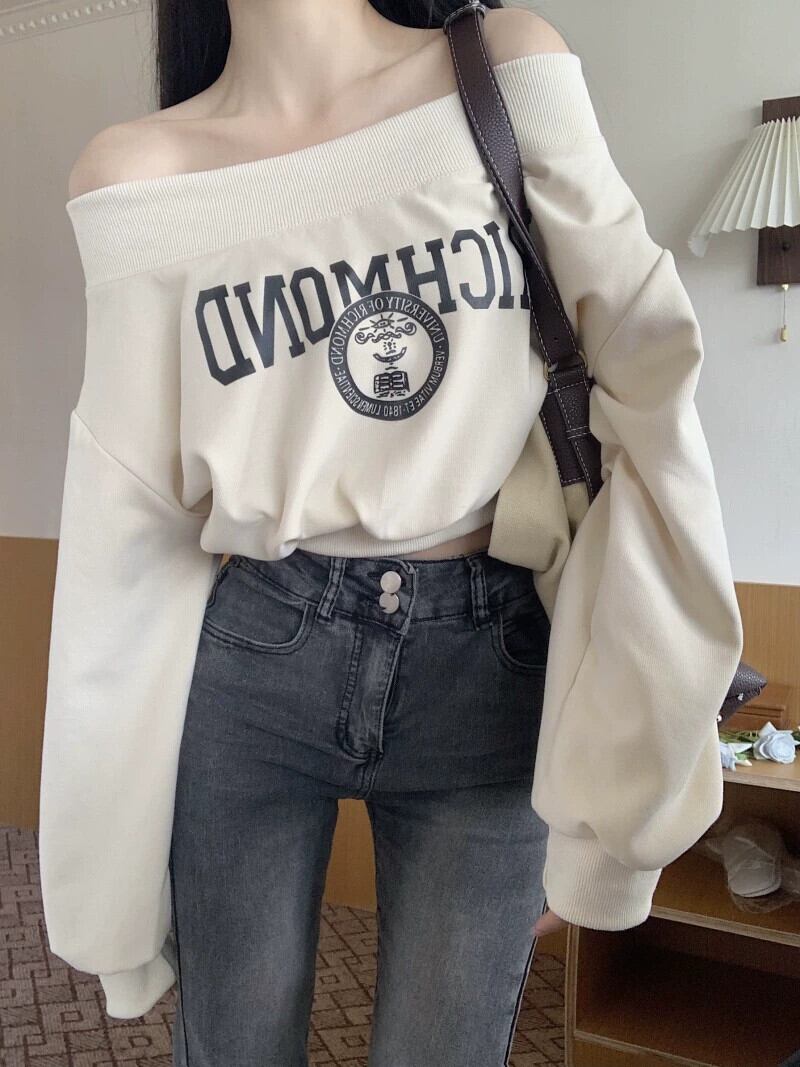 ワンショルダースウェットシャツの女性の春と秋の2024新しいハイエンドアメリカンレトロネクタイブラックオフショルダーショートトップ スプリング 春物 オータム 秋物 8571699914591150
