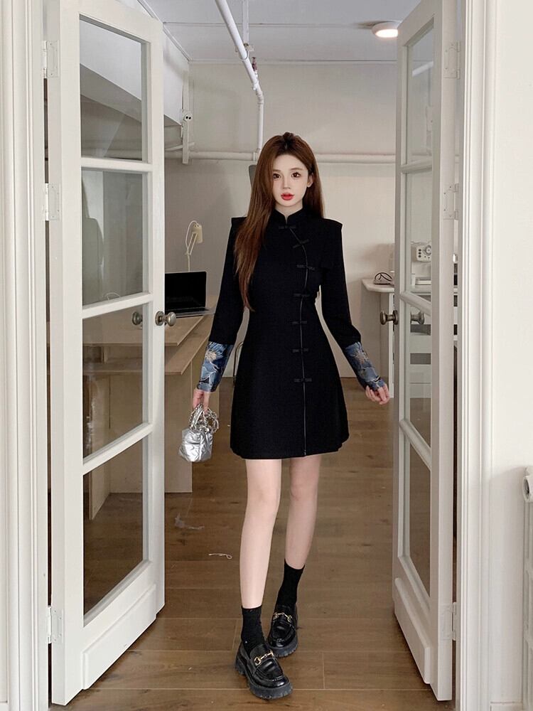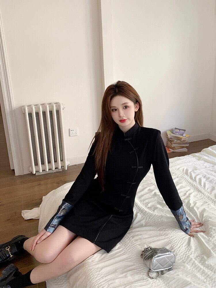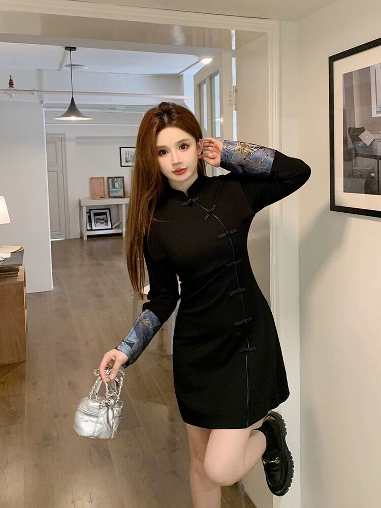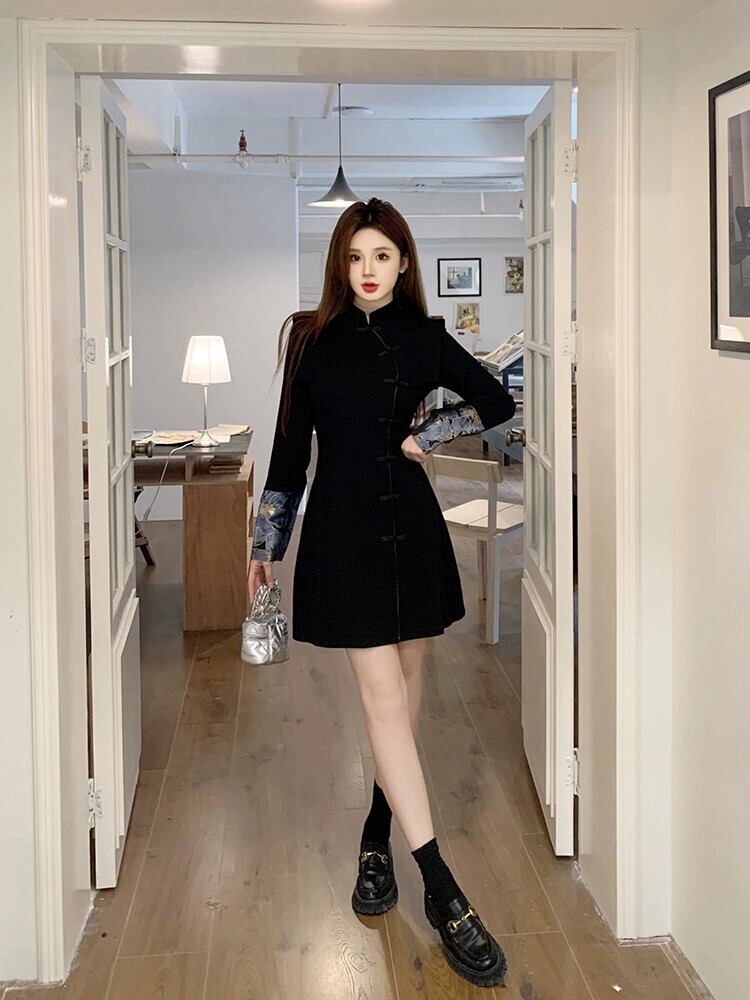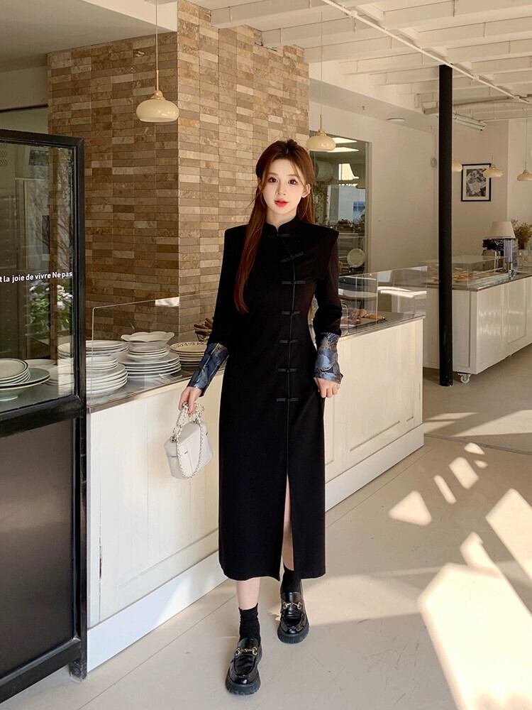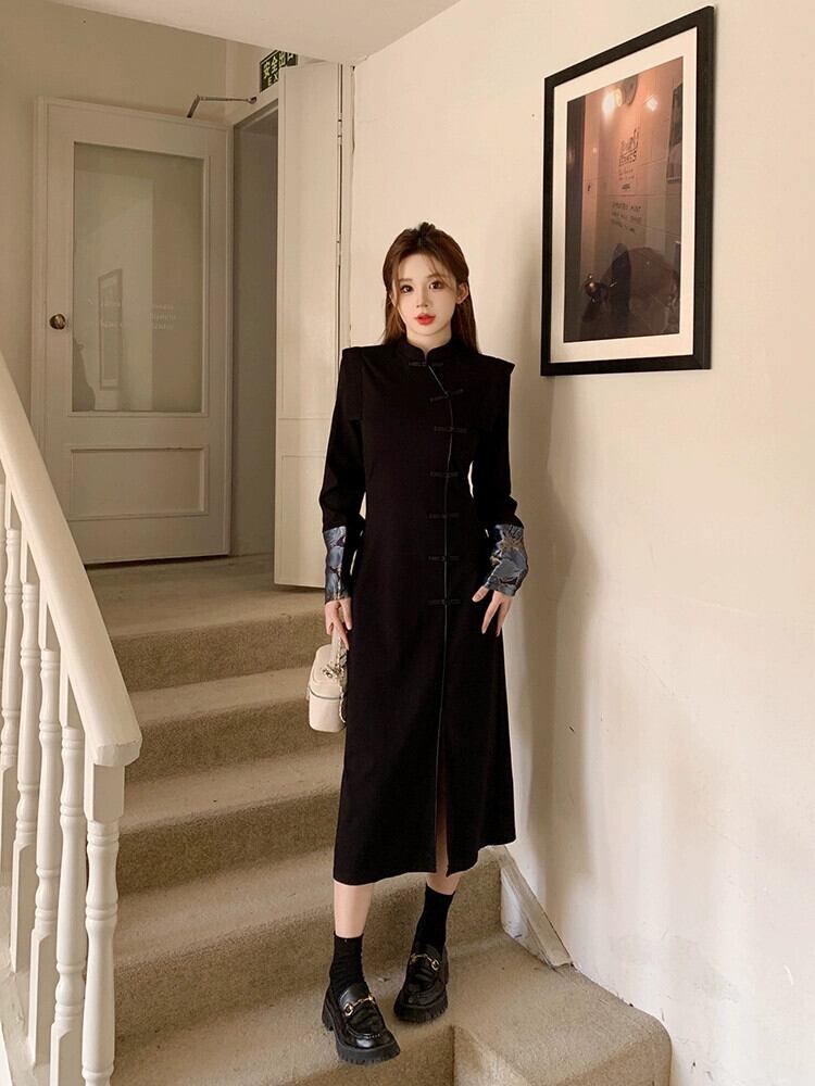 レトロ改良された新しい中国風のチャイナドレス女性の秋と冬2024新しいスタイルのディスクバックルウエスト痩身スリットヒップスカート オータム 秋物 ウィンター 冬物 8571672119200715