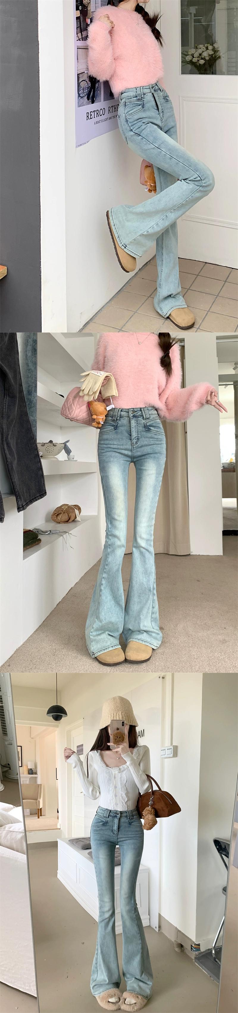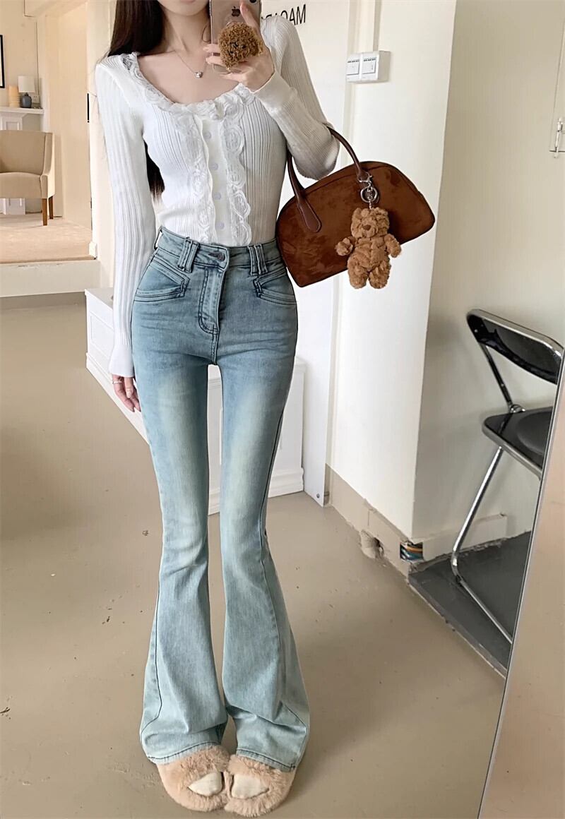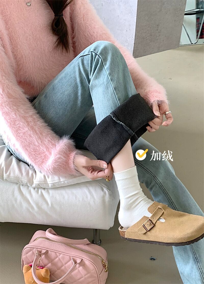 秋冬のライトブルージーンズレディース、ベルベットと厚みのあるマイクロフレアパンツ、今年最も人気のあるレトロなフロアレングスパンツ オータム 秋物 ウィンター 冬物 8571665142895935