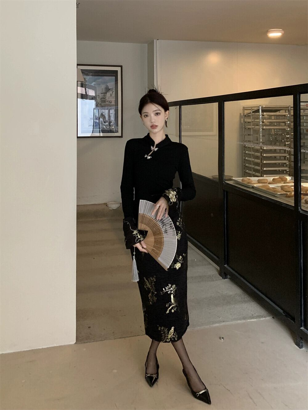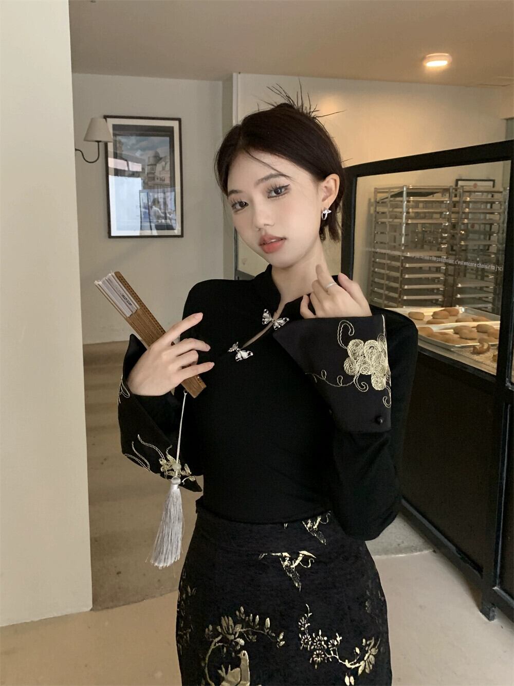 中国風の国民風長袖 Tシャツ女性 2024 春の新ハイエンド刺繍ディスクボタンスタンドカラートップ ロング レッド スプリング 春物 8571661720315640
