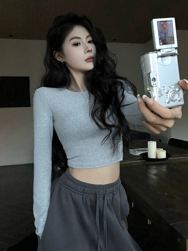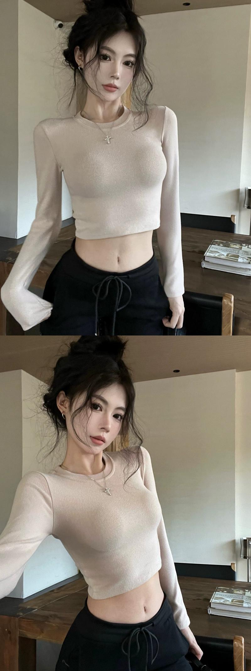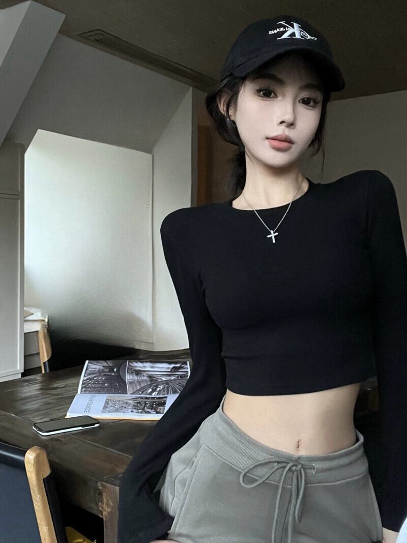秋のホットなへそ出しショート T シャツ レディース、ベルベットと起毛ブラックのラウンド ネック トップ、肩パッド、長袖、インナー ボトム シャツ イン ロング オータム 秋物 Oネック Tシャツ 8571629377806305