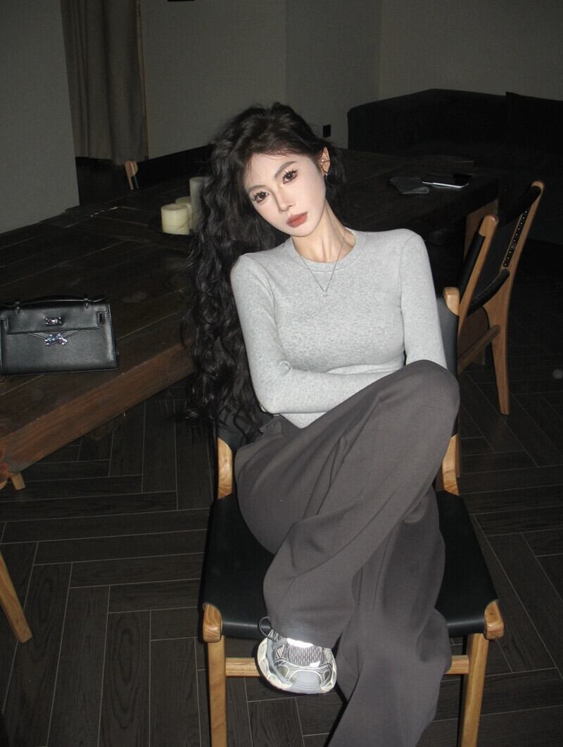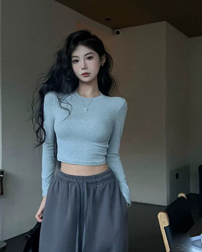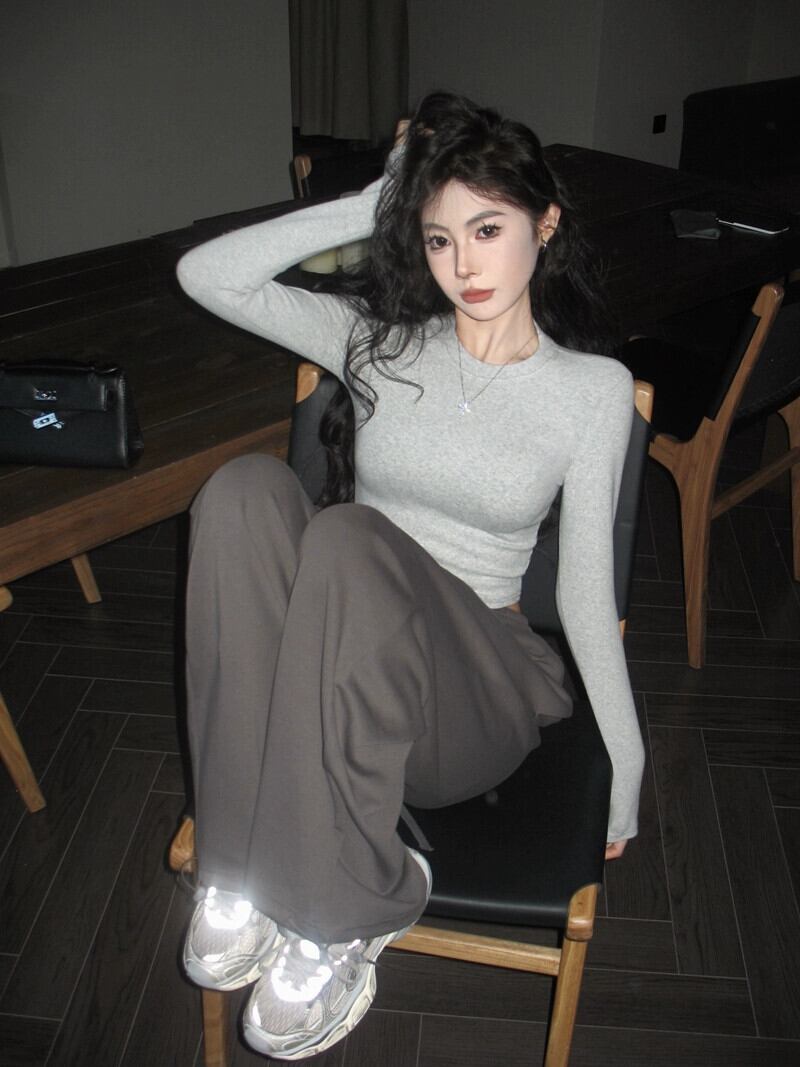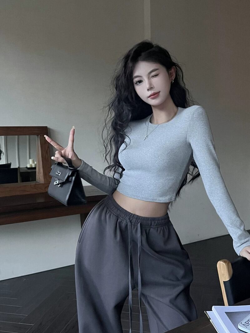 秋のホットなへそ出しショート T シャツ レディース、ベルベットと起毛ブラックのラウンド ネック トップ、肩パッド、長袖、インナー ボトム シャツ イン ロング オータム 秋物 Oネック Tシャツ 8571629377806305