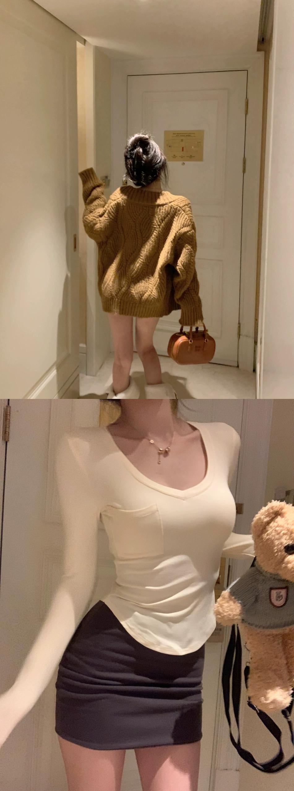 色:グレースカート,黄色の長袖Tシャツ,茶色のセーターコート