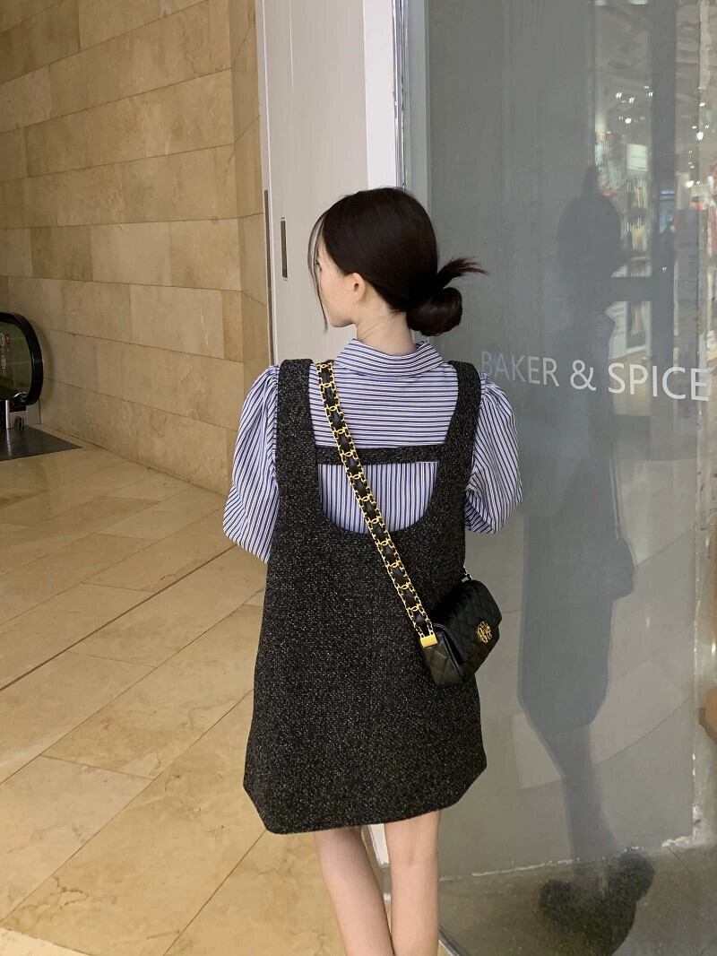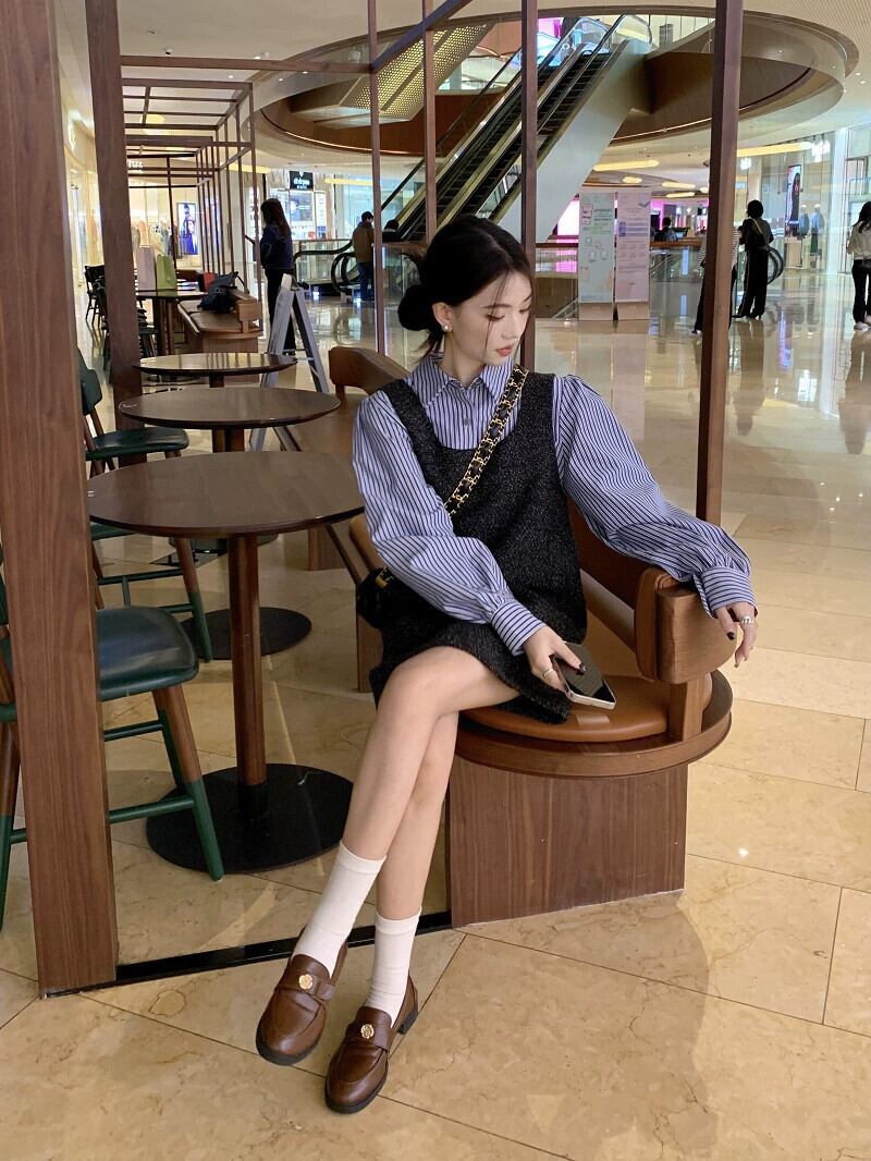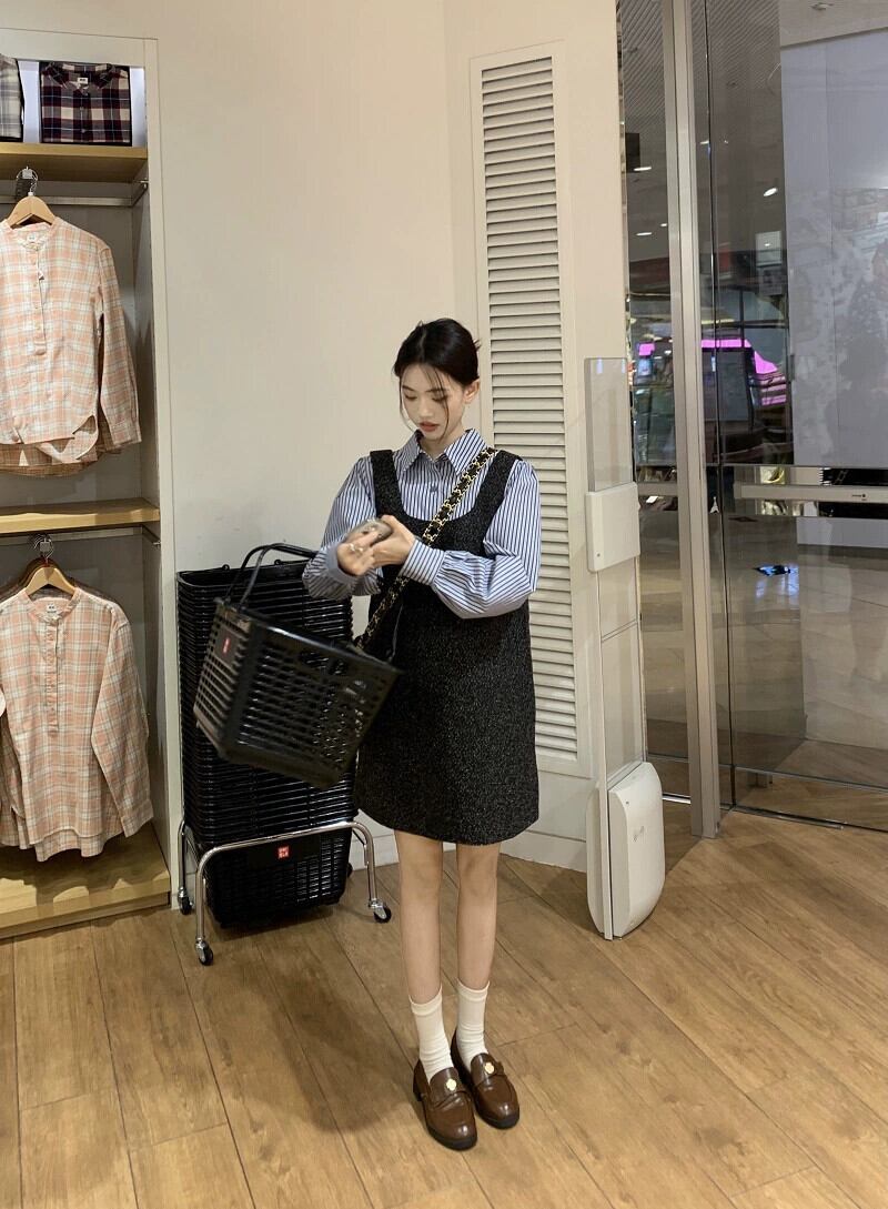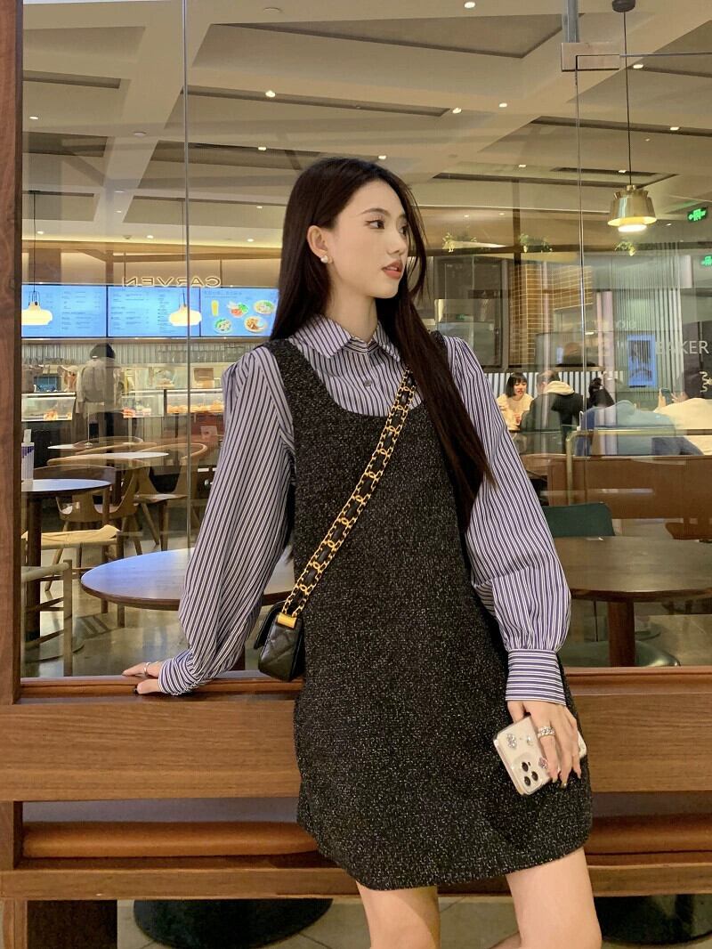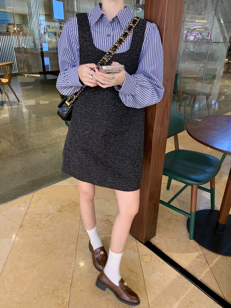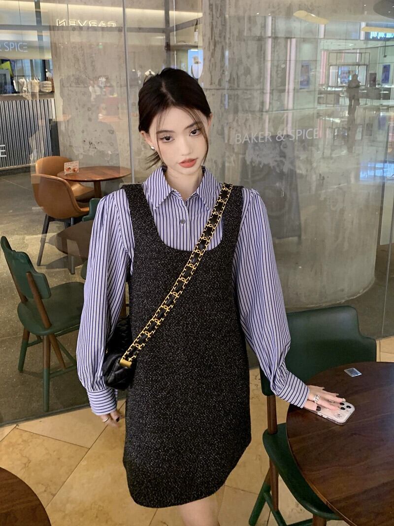 色:ストライプシャツ,グレーのドレス