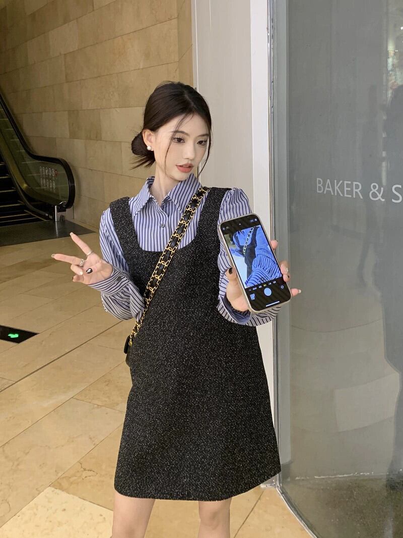 Xiaoxiangfeng ベストドレス女性の秋 2024 新しいハイエンドウエスト痩身サスペンダースカート黒ショートスカート ブラック オータム 秋物 8571673757853705
