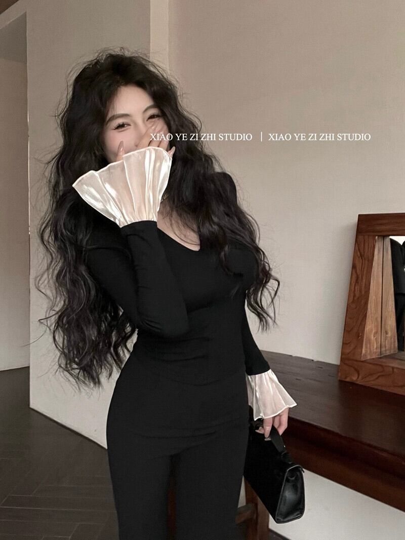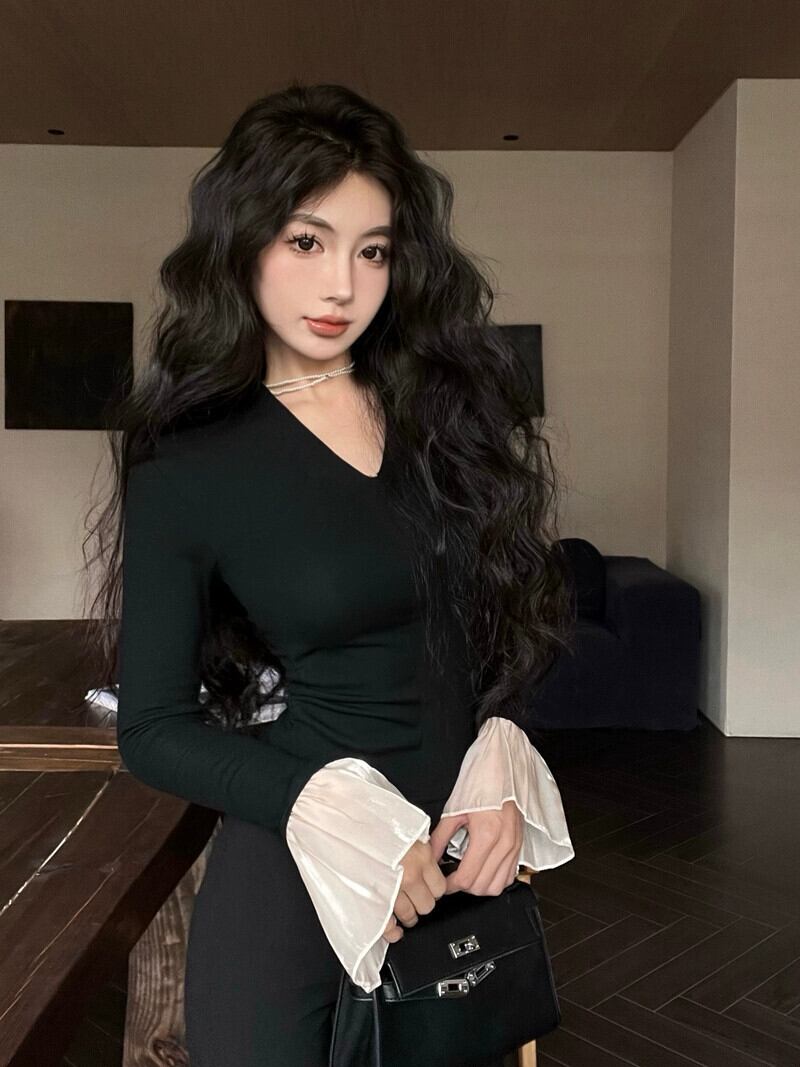 ホットスタイル V ネックタートルネックスプライシングトランペットスリーブトップ女性の秋と冬のタイトフィットベルベットインナーボトリングシャツ長袖 T シャツ ロング オータム 秋物 ウィンター 冬物 Vネック Tシャツ 8571644327465809