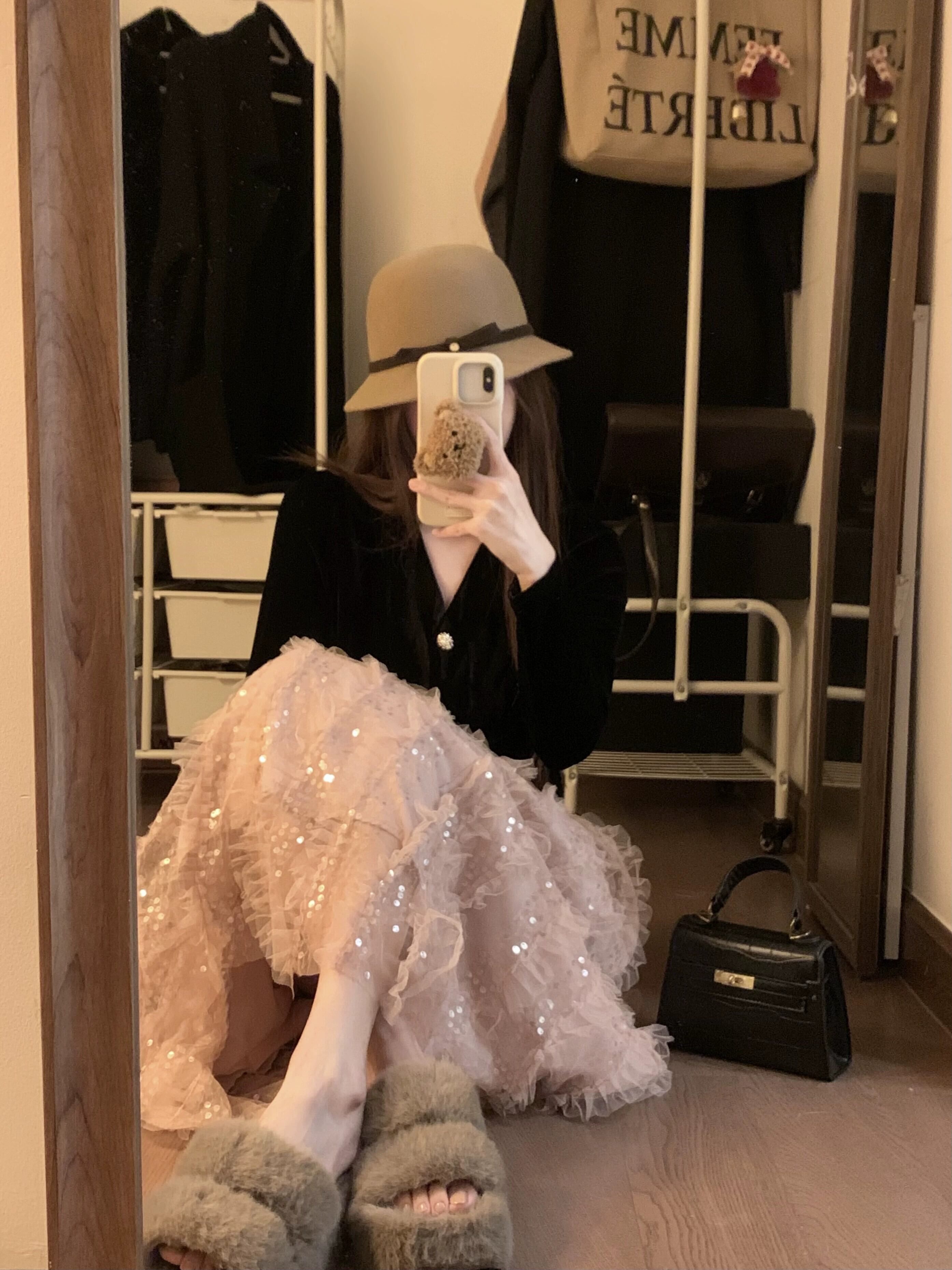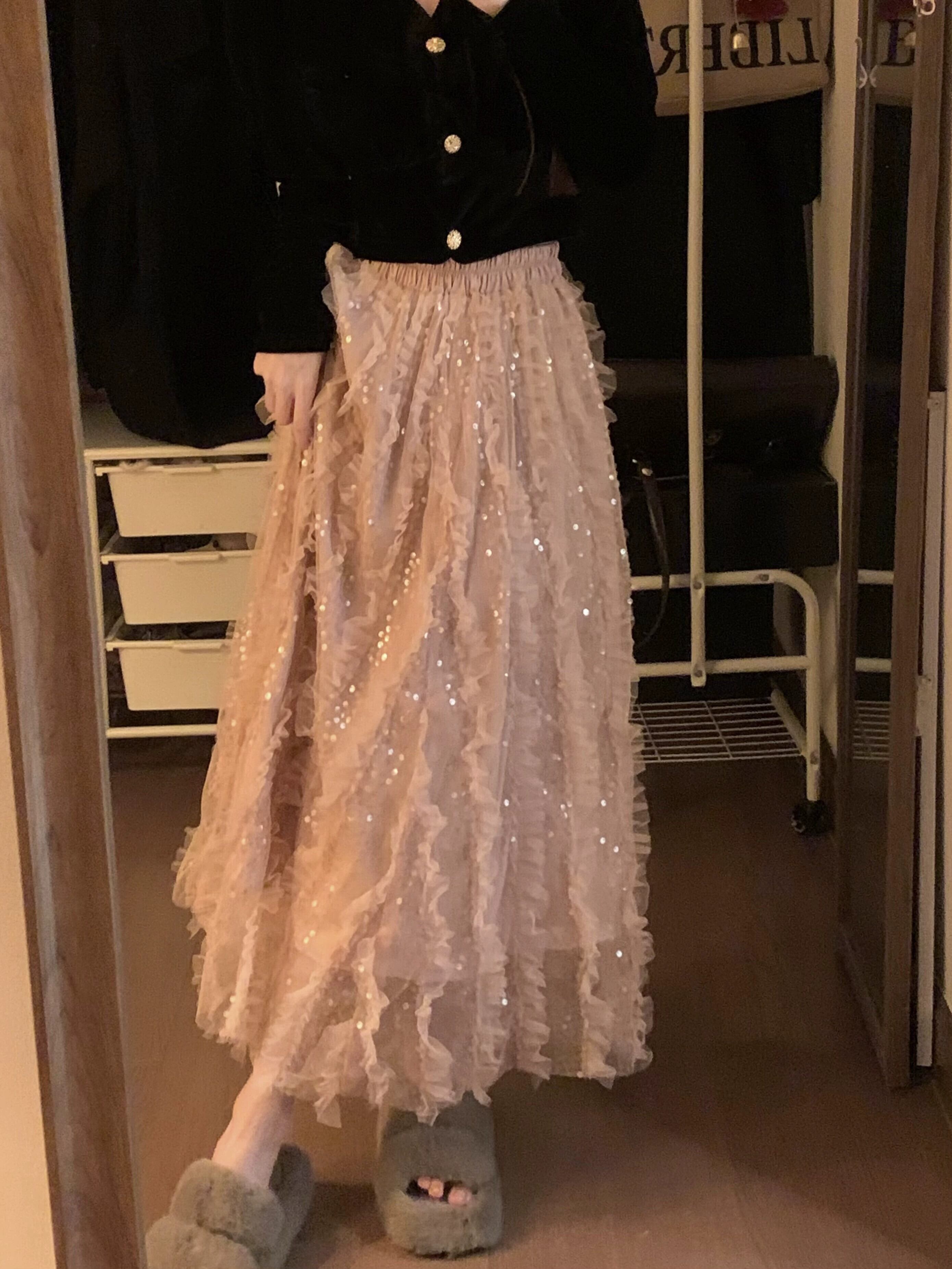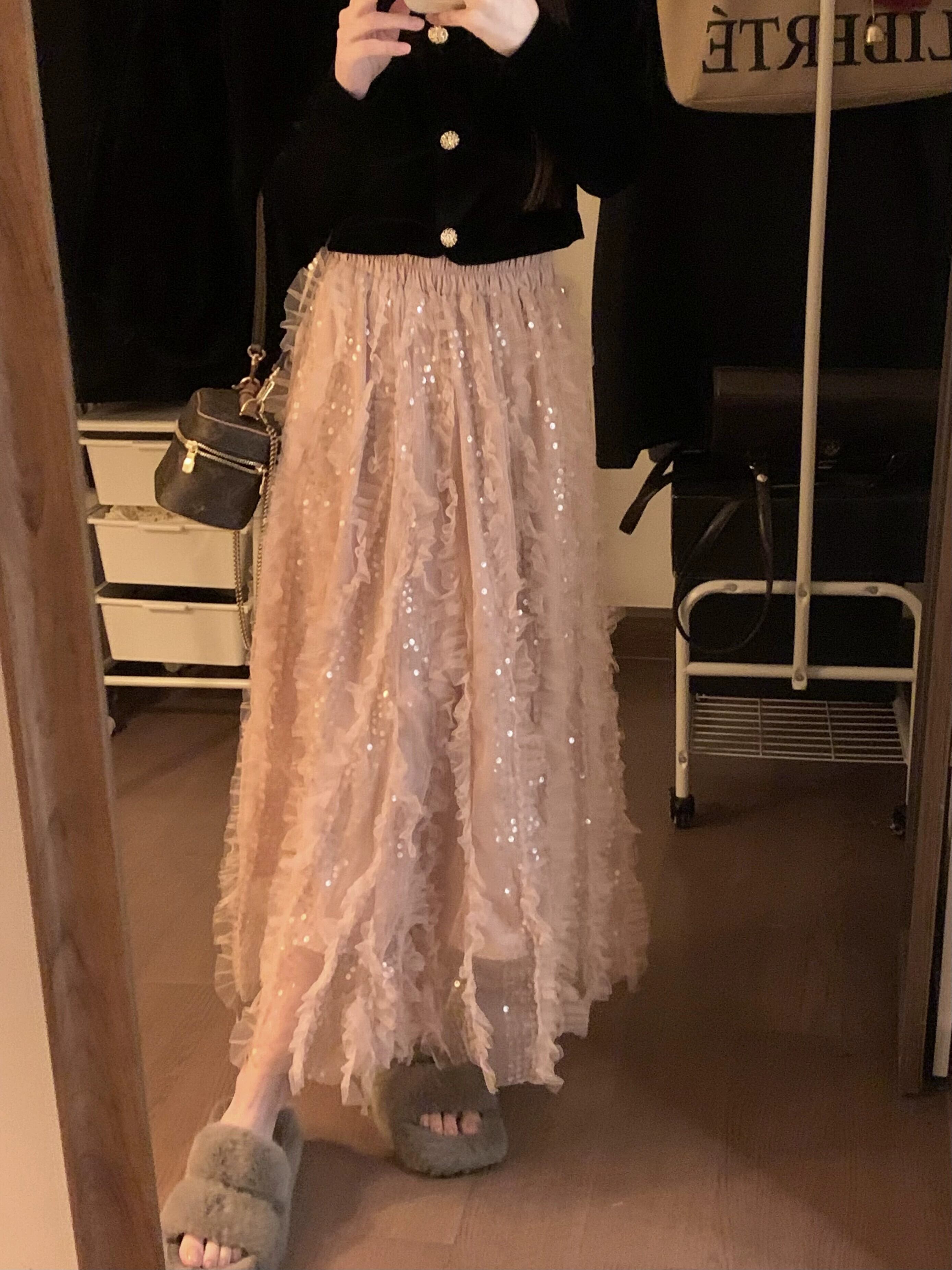 重工業 スパンコール スカート レディース 2024 春 フレンチ ジェントル ウエスト スリム ミドル丈 A ライン スカート スプリング 春物 Aライン 8571667586123817