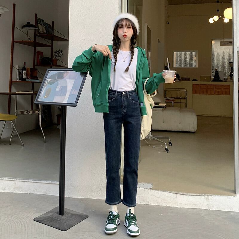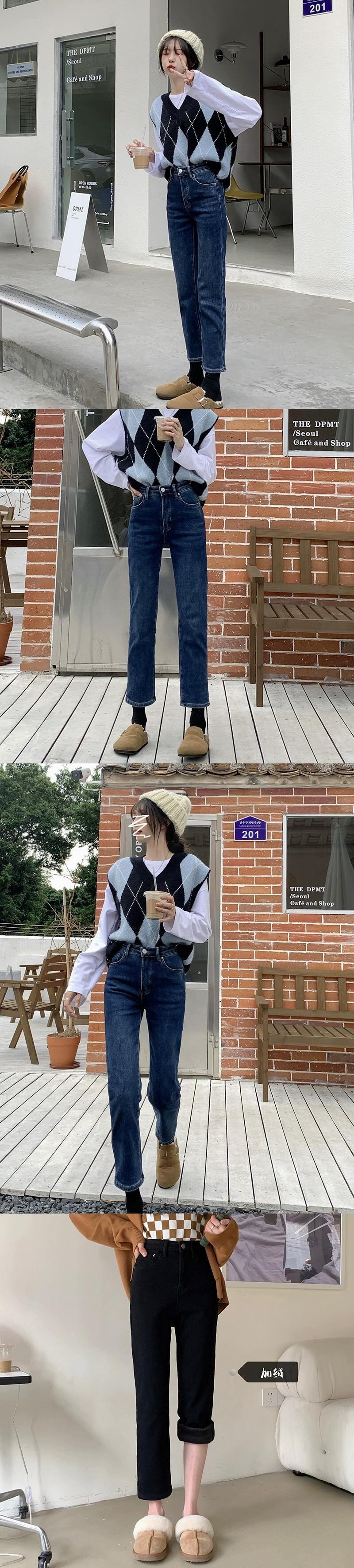秋冬のダークブルーのジーンズの女性にベルベットと厚みのある9点ストレートパンツ、小柄な人、ハイウエスト、スリムなシガレットパンツ ハイウェスト オータム 秋物 ウィンター 冬物 8571653511209629