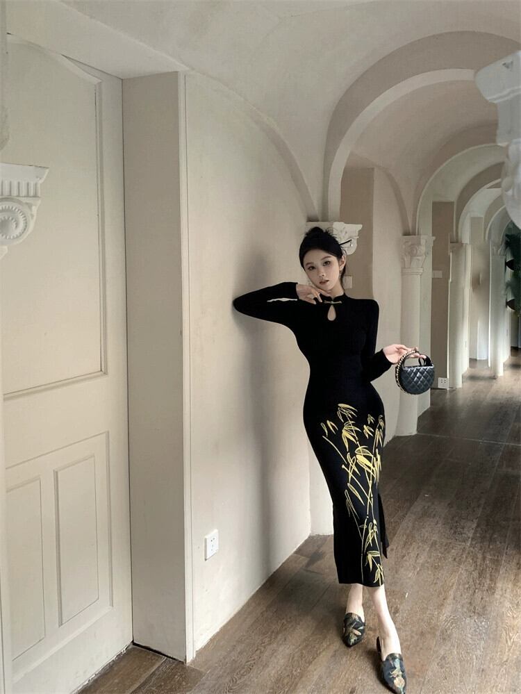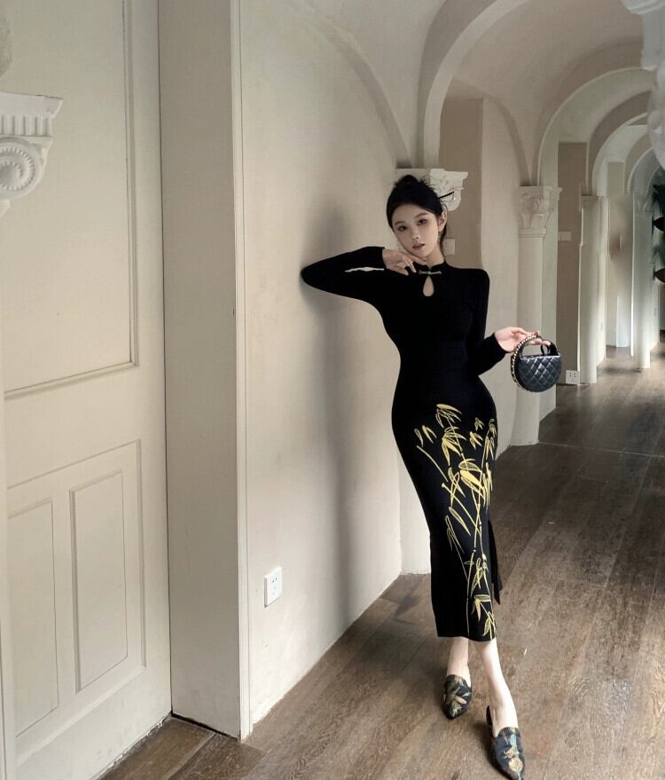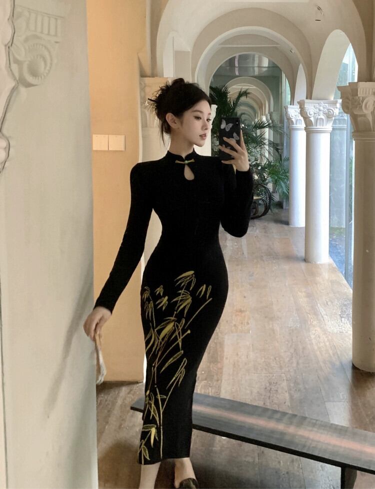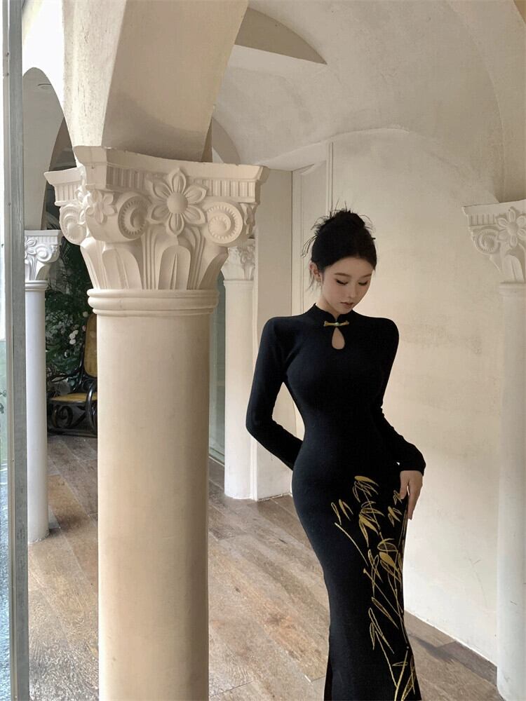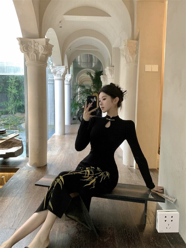 国家スタイルの新中国風の黒ニットドレス秋と冬 2024 新しいスタイルのプレートバックルウエスト痩身フィッシュテールヒップスカート ブラック オータム 秋物 ウィンター 冬物 8571640460585096