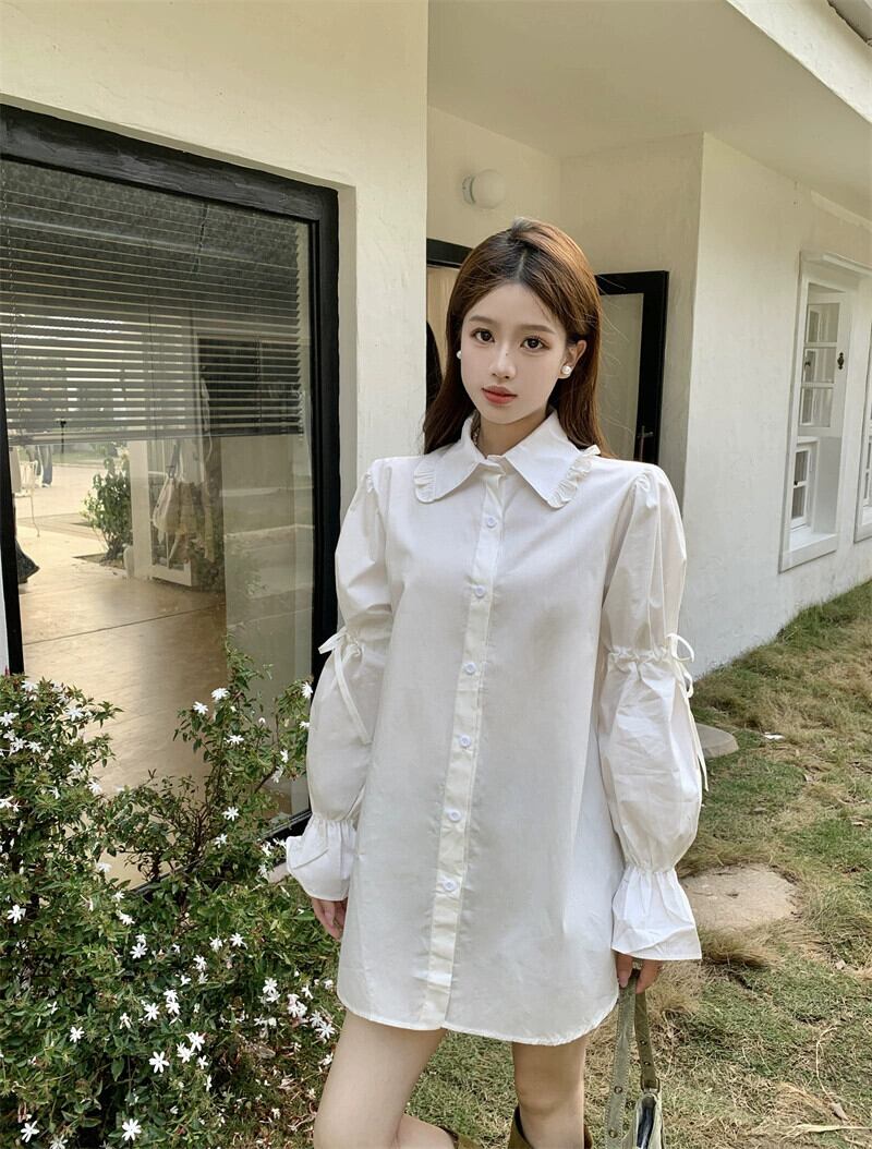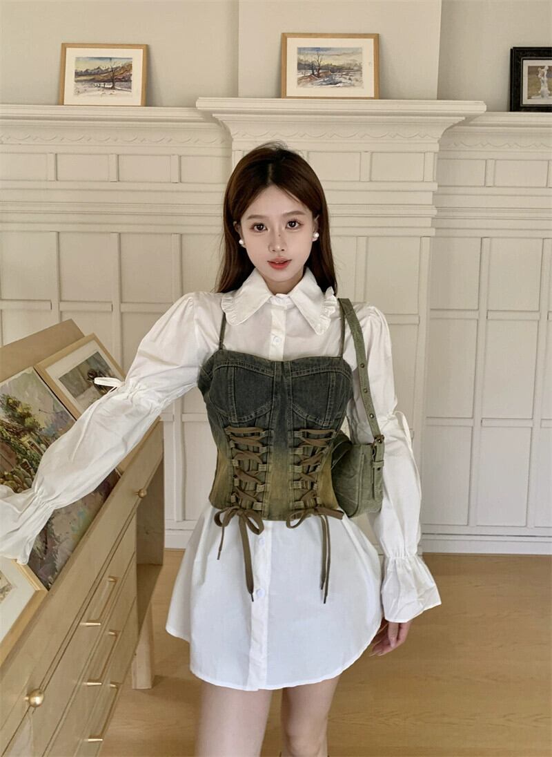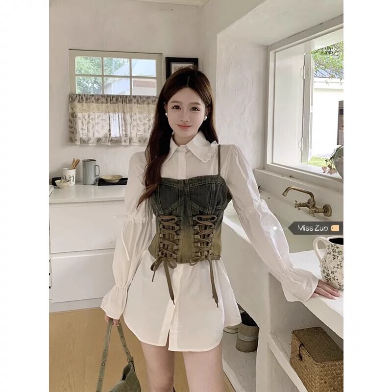 シックでユニークなデニムサスペンダーシャツドレス女性秋 2024 新しいハイウエストスリム白シャツスカート ホワイト オータム 秋物 8571628737972447