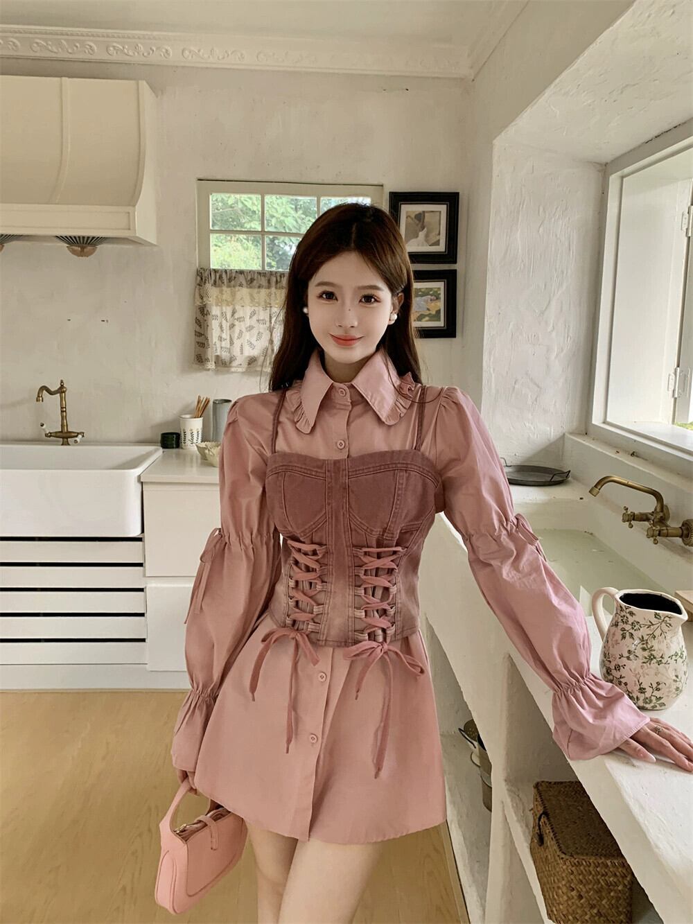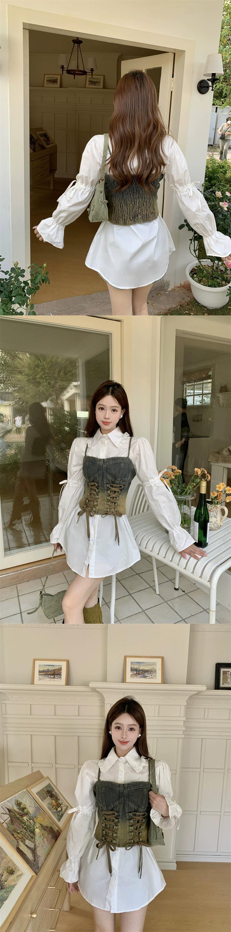 色:白シャツ+デニムベスト,ピンクのシャツ+デニムベスト,白いシャツのワンピース,ピンクのシャツワンピース