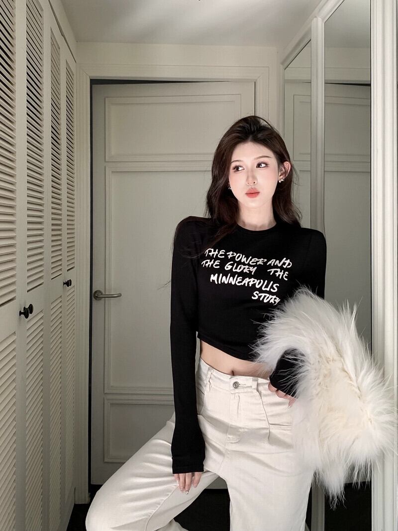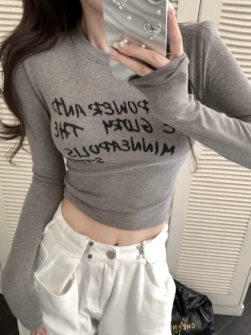 ホットスタイルレターグラフィティプリント長袖 Tシャツ女性春スリムフィットショートプラスベルベットインナーショルダーパッドボトミングトップ ロング スプリング 春物 8571676355369645