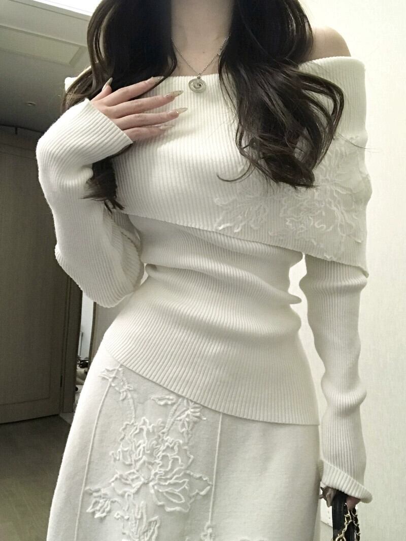 フランスのワンショルダー刺繍白セーター女性秋冬 2024 新しいスリムフィットオフショルダーセータートップ ホワイト レッド オータム 秋物 ウィンター 冬物 8571619998004112