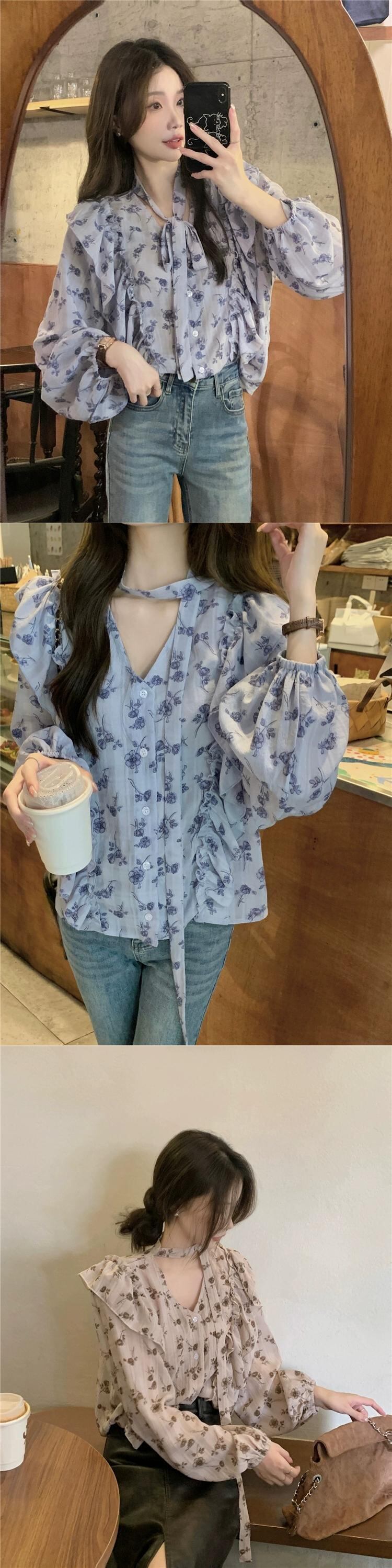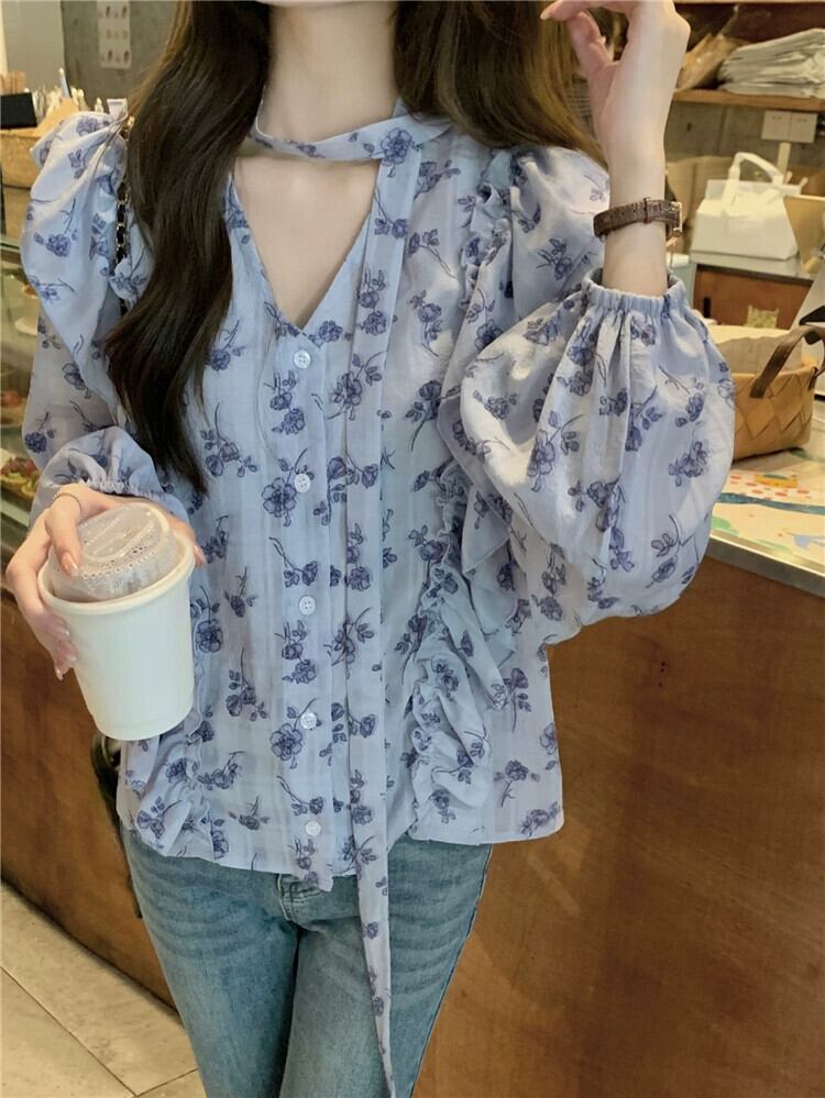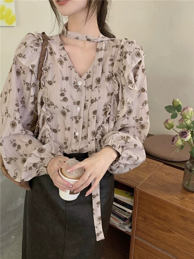 フレンチライト成熟したスタイル多目的 V ネックシャツ女性 2024 年春の新しいスタイルのシングルブレストフリルレースアッププリントトップ スプリング 春物 Vネック 8571643530993130