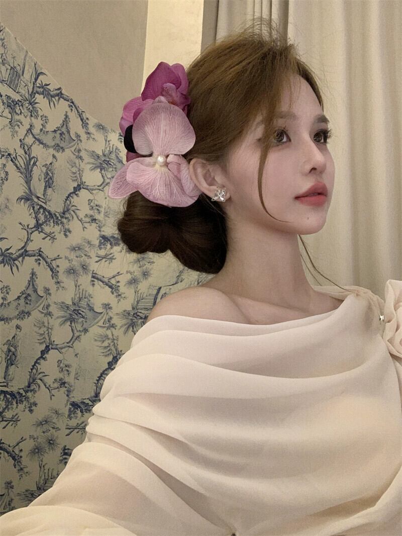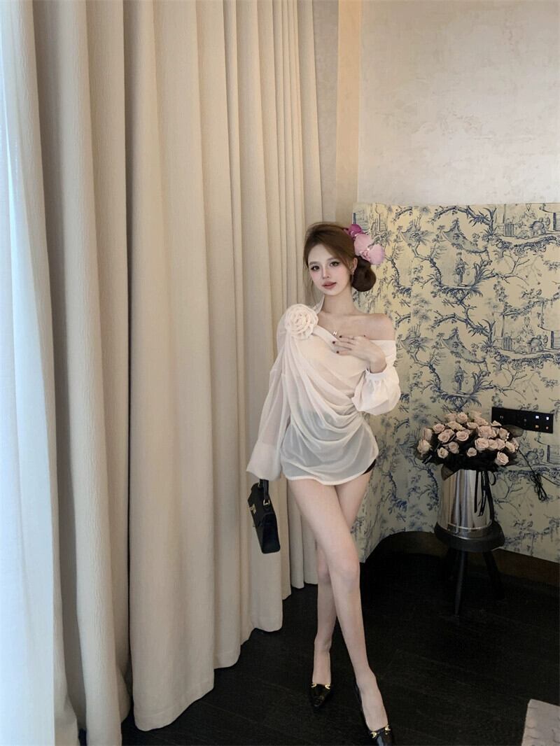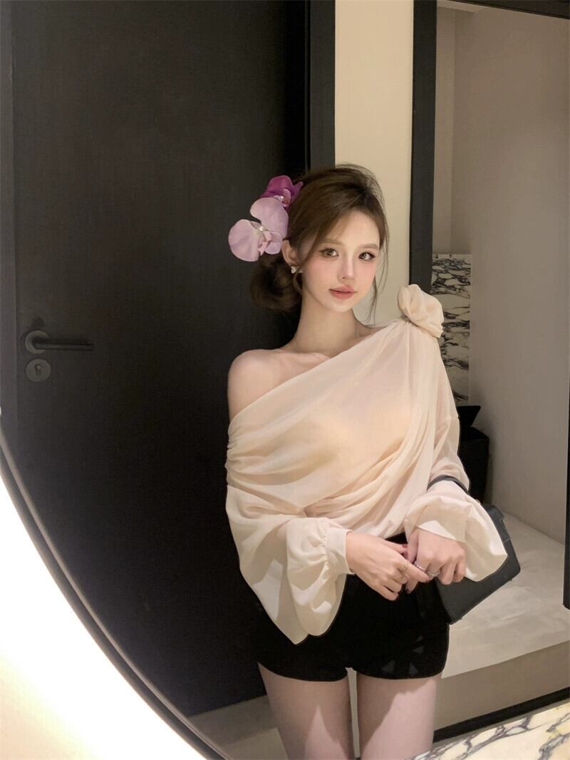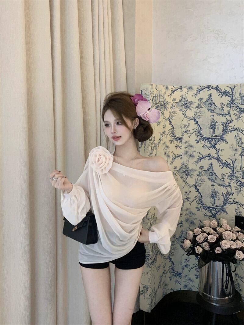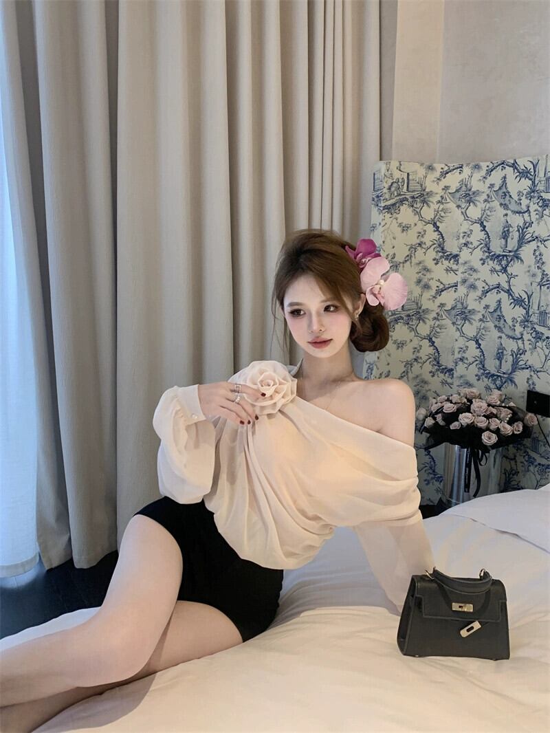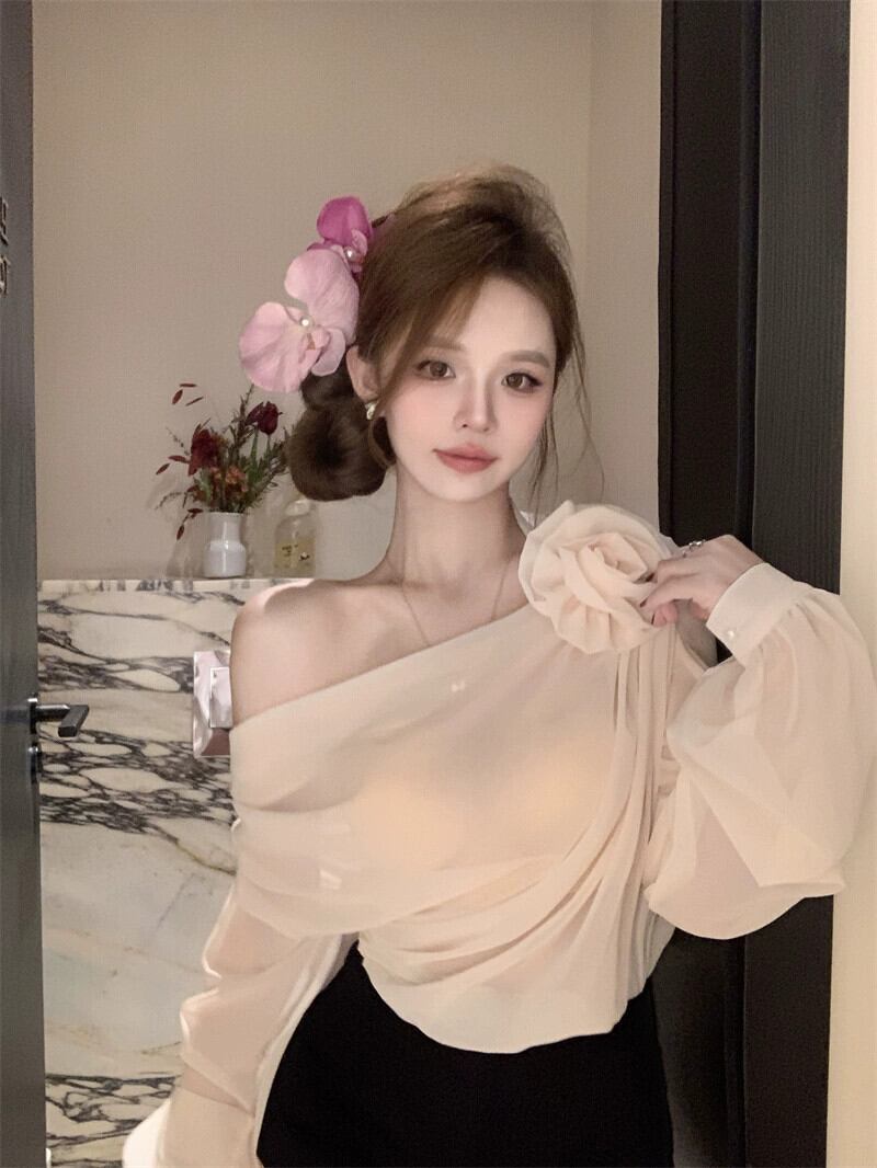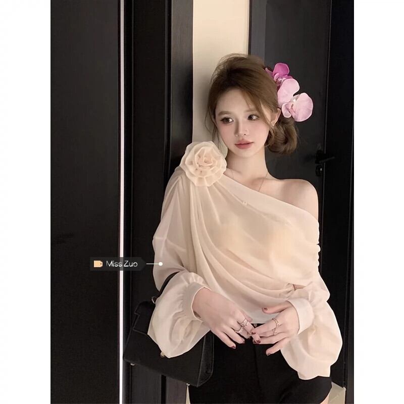 フランスの不規則なスロープカラー長袖フラワー Tシャツ女性の 2024 年春の新しい気質ショートオフショルダートップ ロング スプリング 春物 フラワーデザイン 8571612515949082