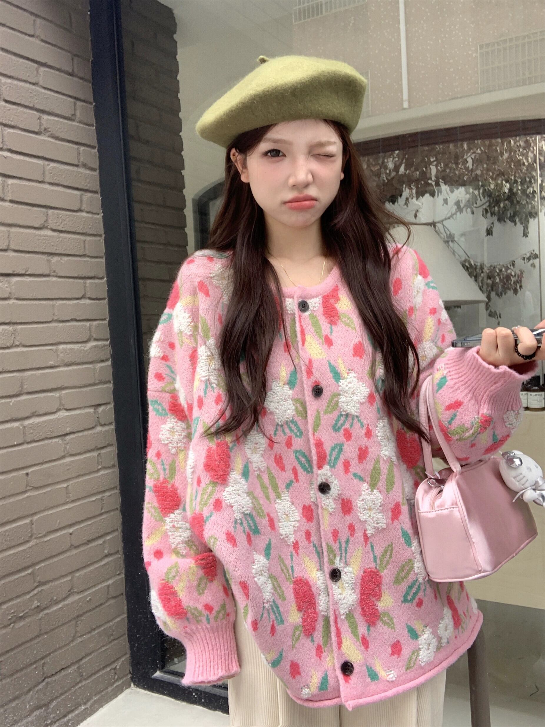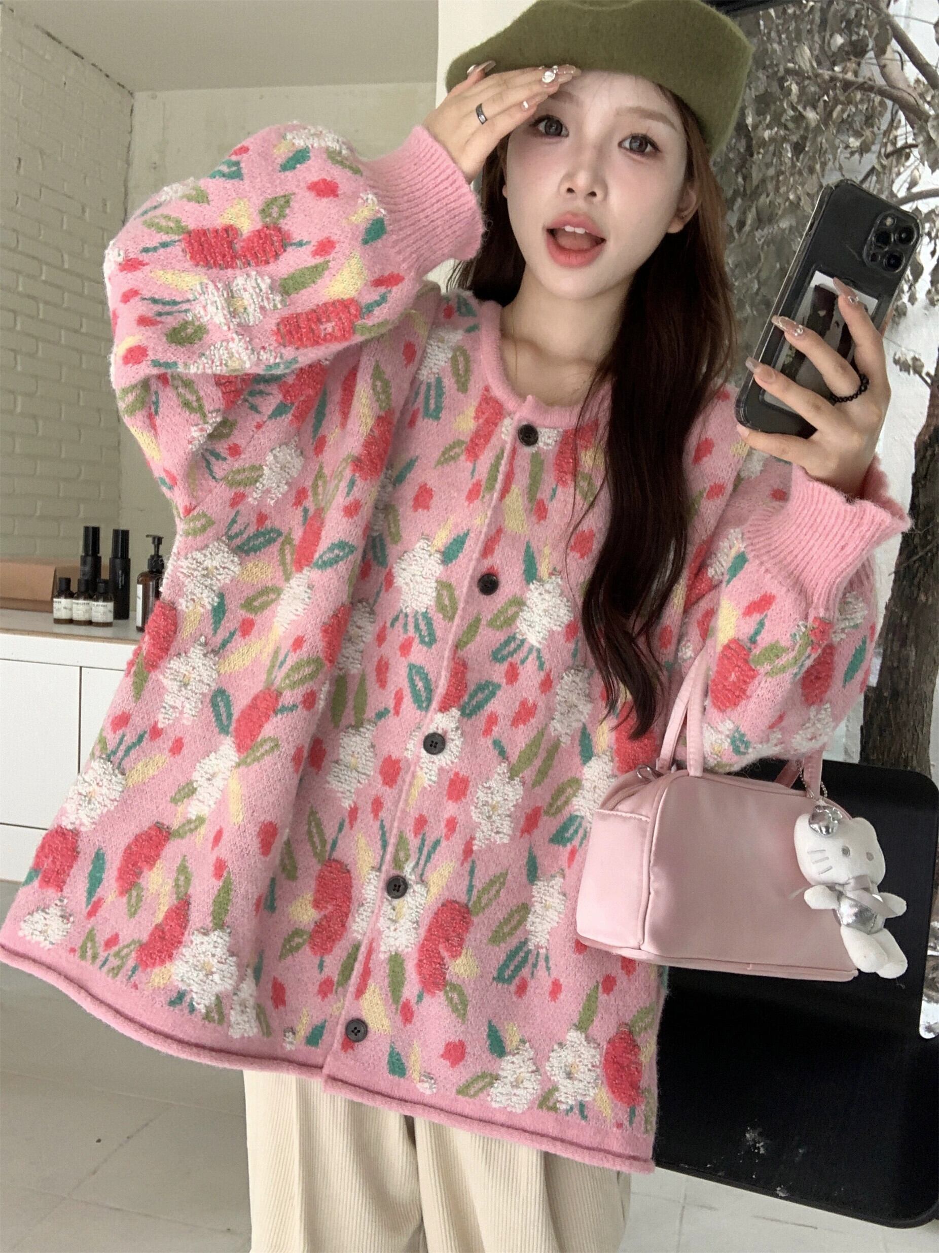 レトロな怠惰なスタイル甘い老化を軽減するピンクのセーターの女性の秋と冬植毛立体花ソフトワックスセータージャケット 大人ガーリー スウィート キュート カジュアル オータム 秋物 ウィンター 冬物 フラワーデザイン 8571611369986410