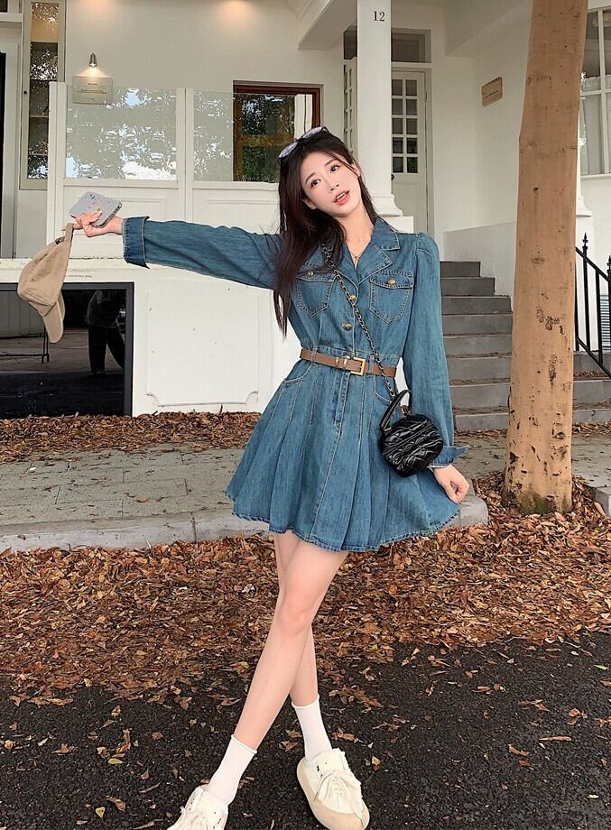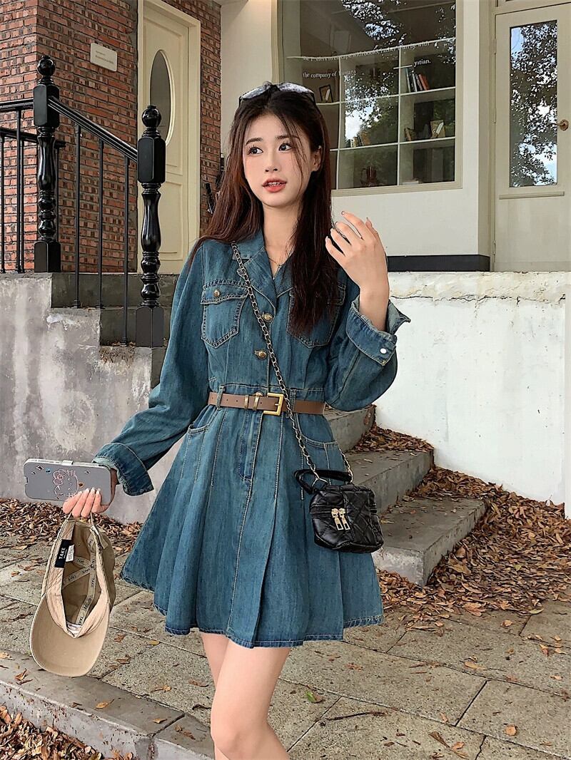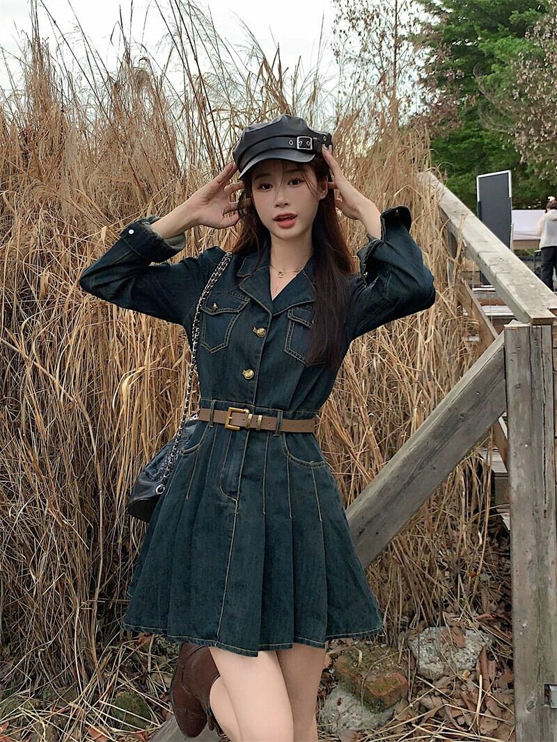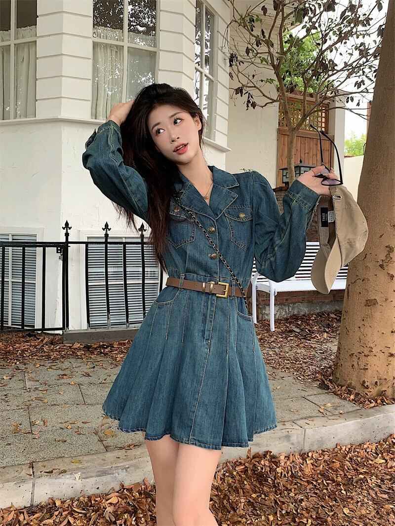 甘辛デニム長袖ドレス女性の秋冬 2024 気質ウエストレトロウォッシュプリーツスカート ロング 大人ガーリー スウィート キュート カジュアル オータム 秋物 ウィンター 冬物 8571673278612895