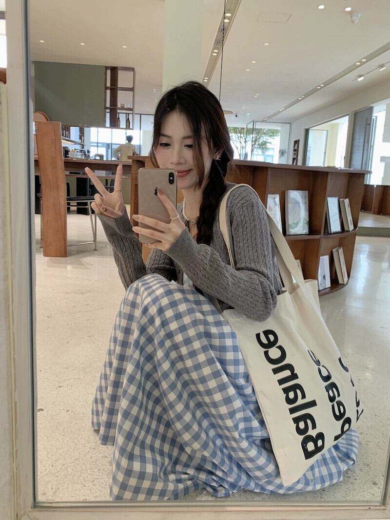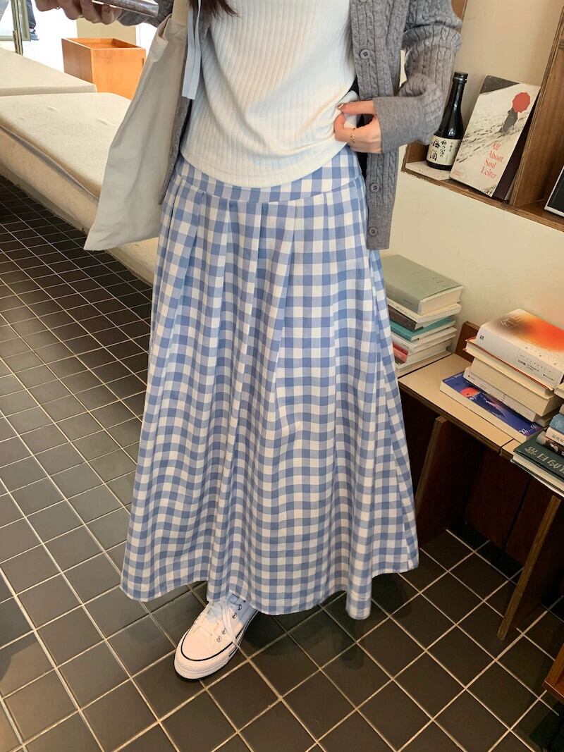 レトロな青と白のチェック柄スカート女性春 2024 新しいカレッジスタイル小さなハイウエストアンブレラスカート a ラインロングスカート ハイウェスト ホワイト ブルー スプリング 春物 Aライン 8571651007395050