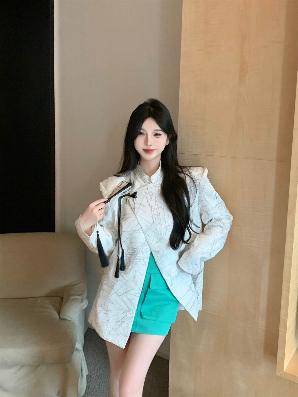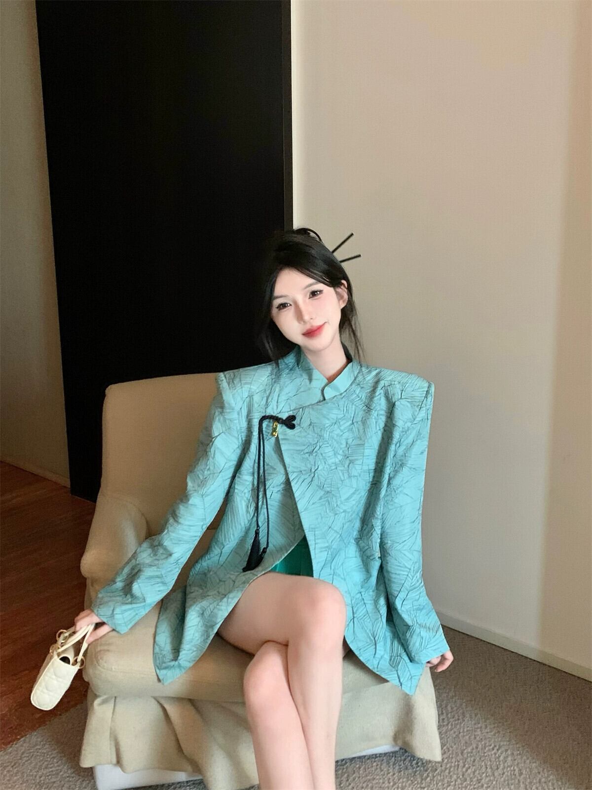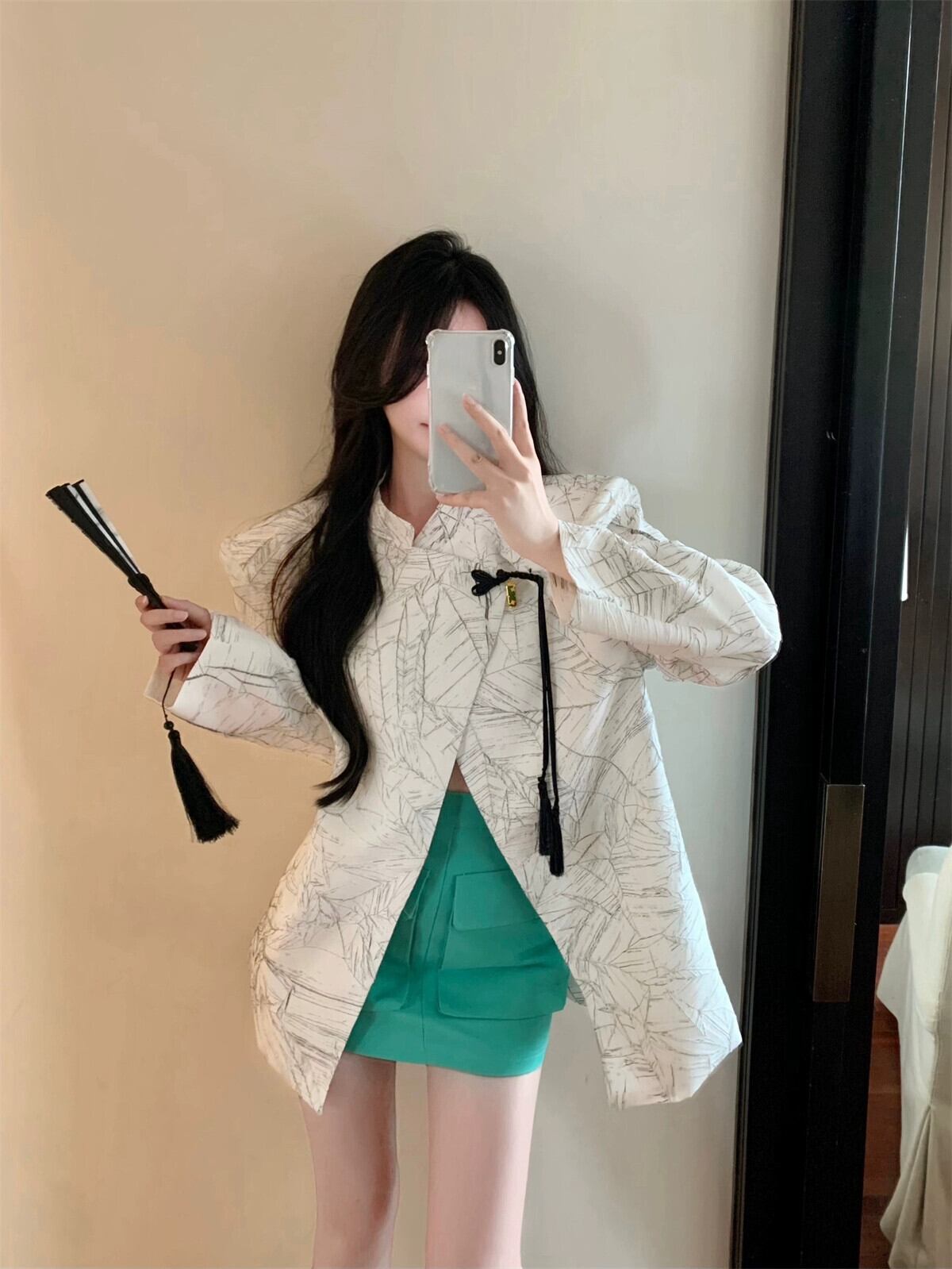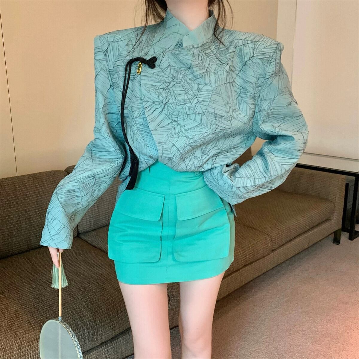 中国風の国民風の葉の質感のスリットプレートバックルジャケットの女性の春と秋のファッショナブルなデザインのニッチシャツトップス スプリング 春物 オータム 秋物 8571686692113716