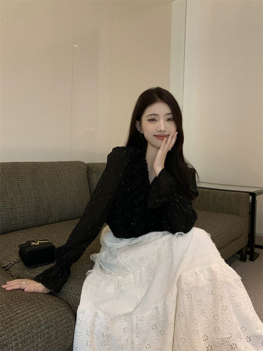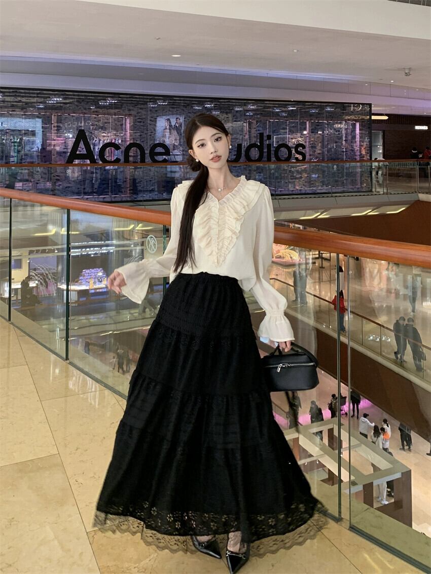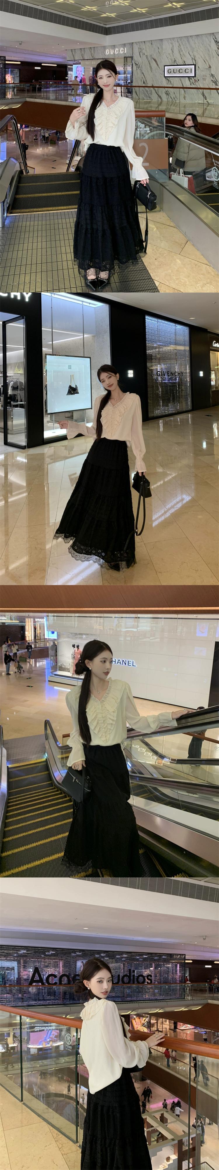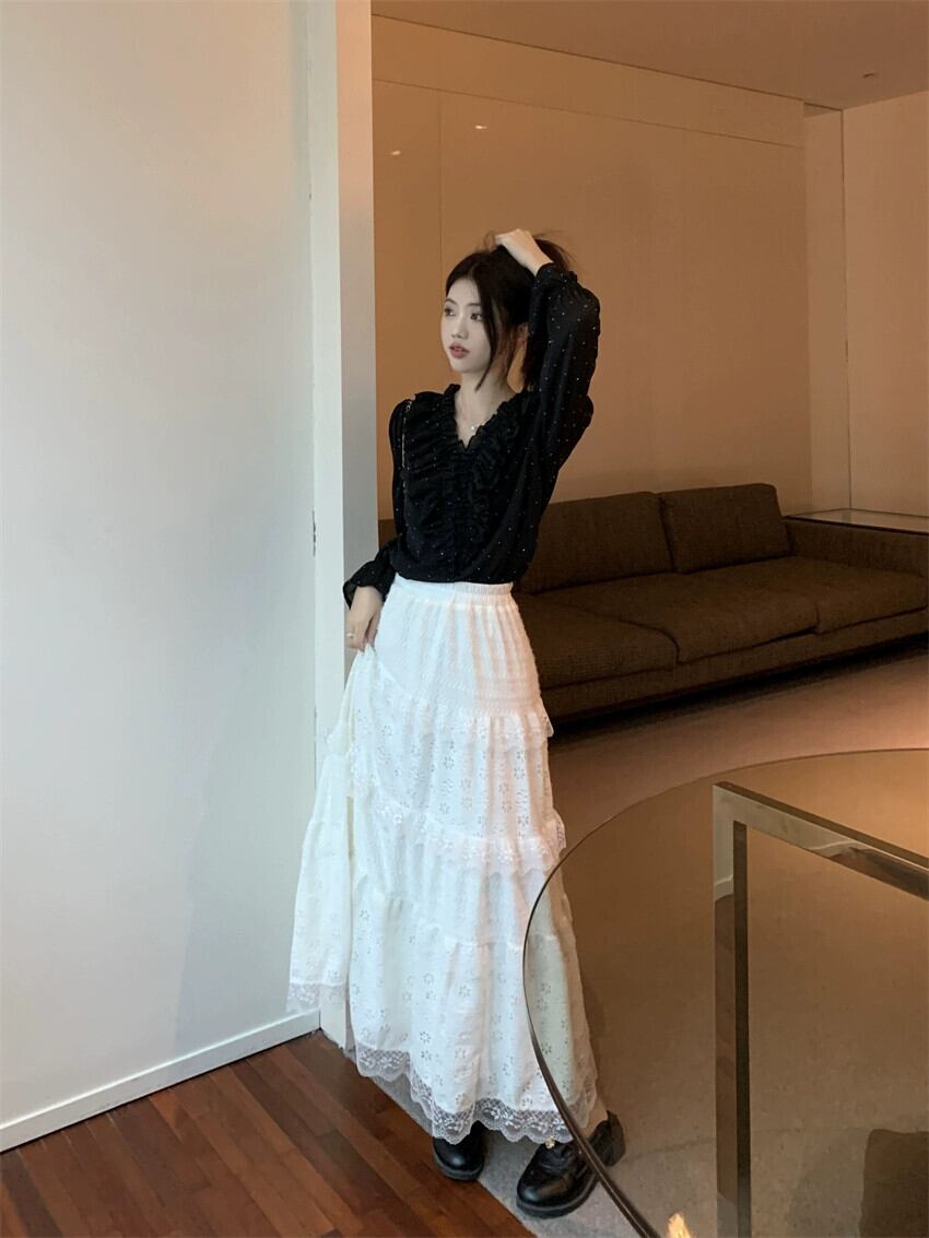 色:白いレースのスカート,ブラックレーススカート,アプリコットVネックトップス,黒のVネックトップ