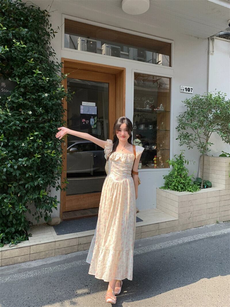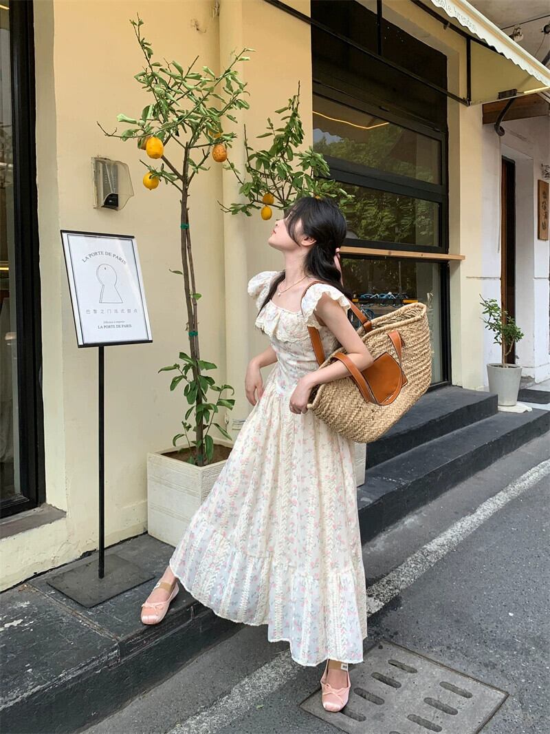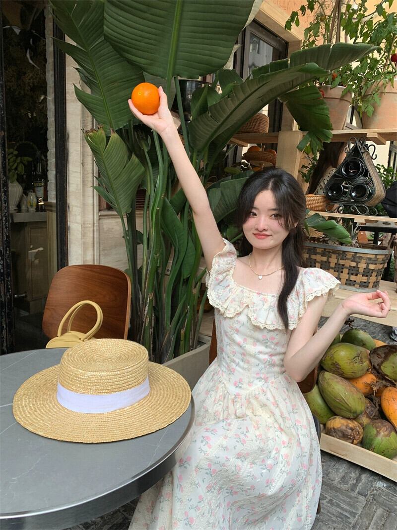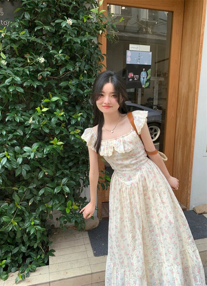 重い刺繍花柄スクエアカラードレスの女性の夏 2024 新しいスタイルフレンチフリルウエスト痩身ロングスカート サマー 夏物 スクウェア 8571614927625662