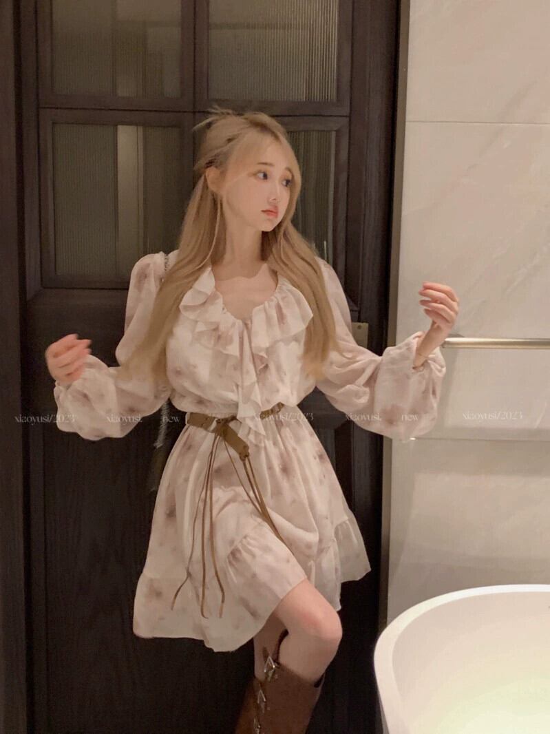 フレンチフリルインク花柄 V ネック花柄ドレス女性春 2024 新しい純粋な欲望の雰囲気ショートスカート スプリング 春物 Vネック ピュア 8571677298718290