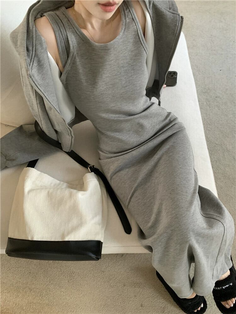 グレーカジュアルスウェットシャツサスペンダードレス女性春 2024 新しいスタイルハイエンドスリム気質底ロングスカート スプリング 春物 8571667937724655