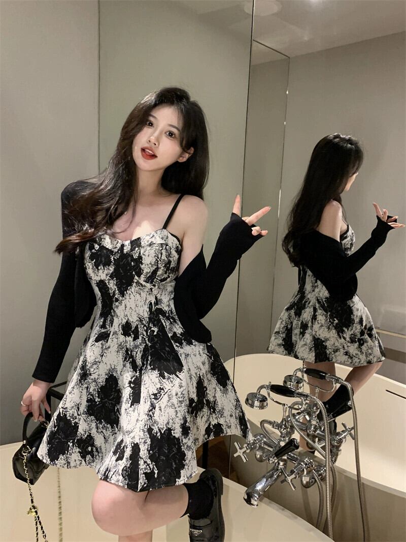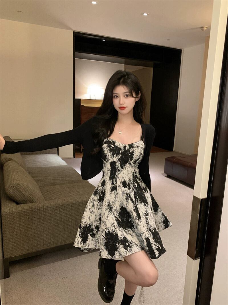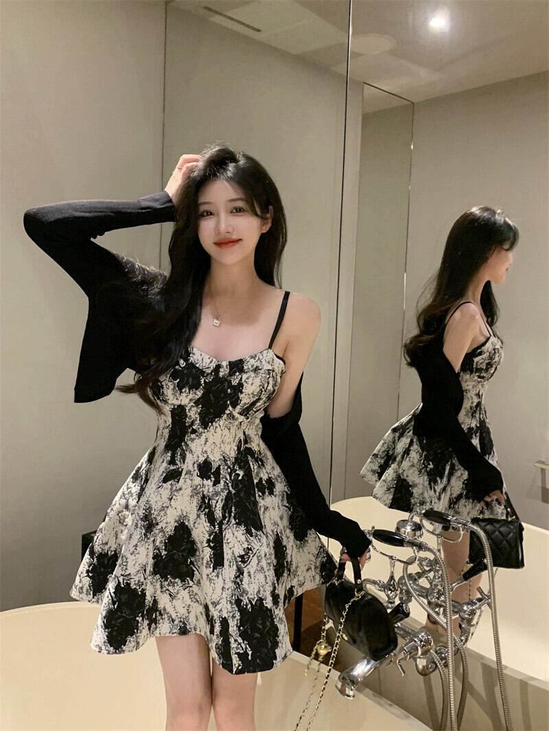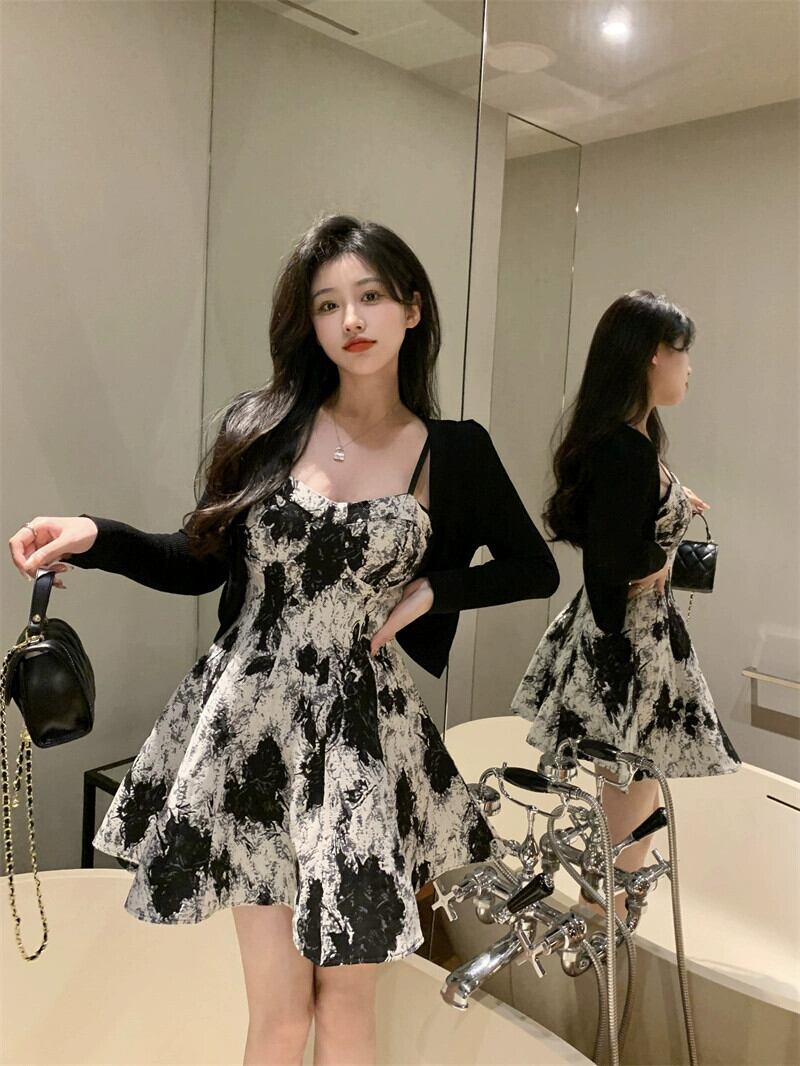レトロ水墨画絞り染めサスペンダードレスの女性の夏 2024 新しいハイエンド姉妹スタイルのウエストを締めるショートスカート サマー 夏物 857168472793033