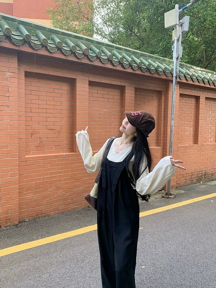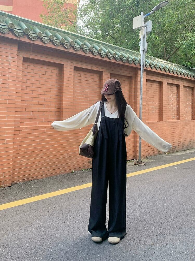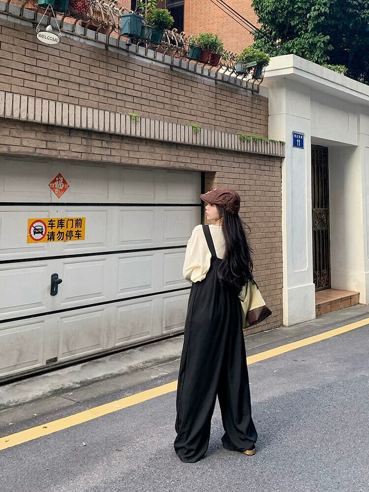ブラックデニムオーバーオール女性 2024 春の新スタイルの小さなハイウエストヒップカバーワイドレッグパンツ年齢を軽減するジャンプスーツ スプリング 春物 8571659096330593