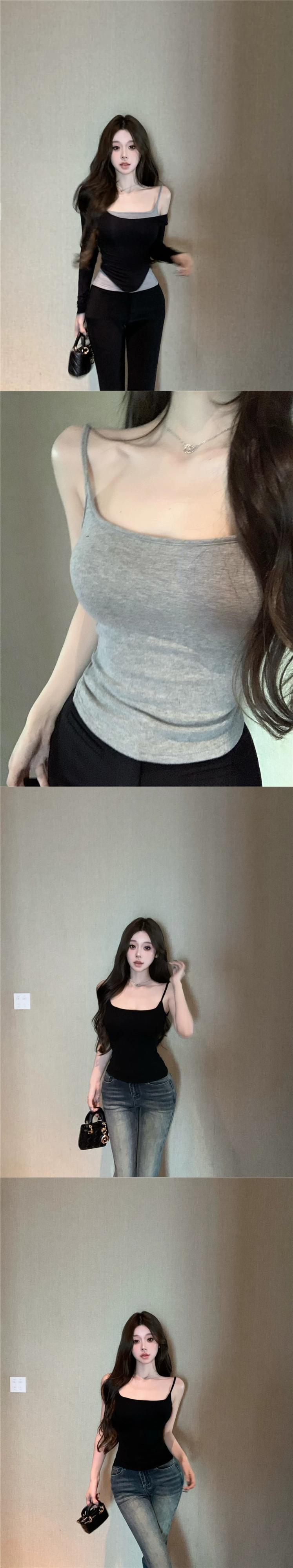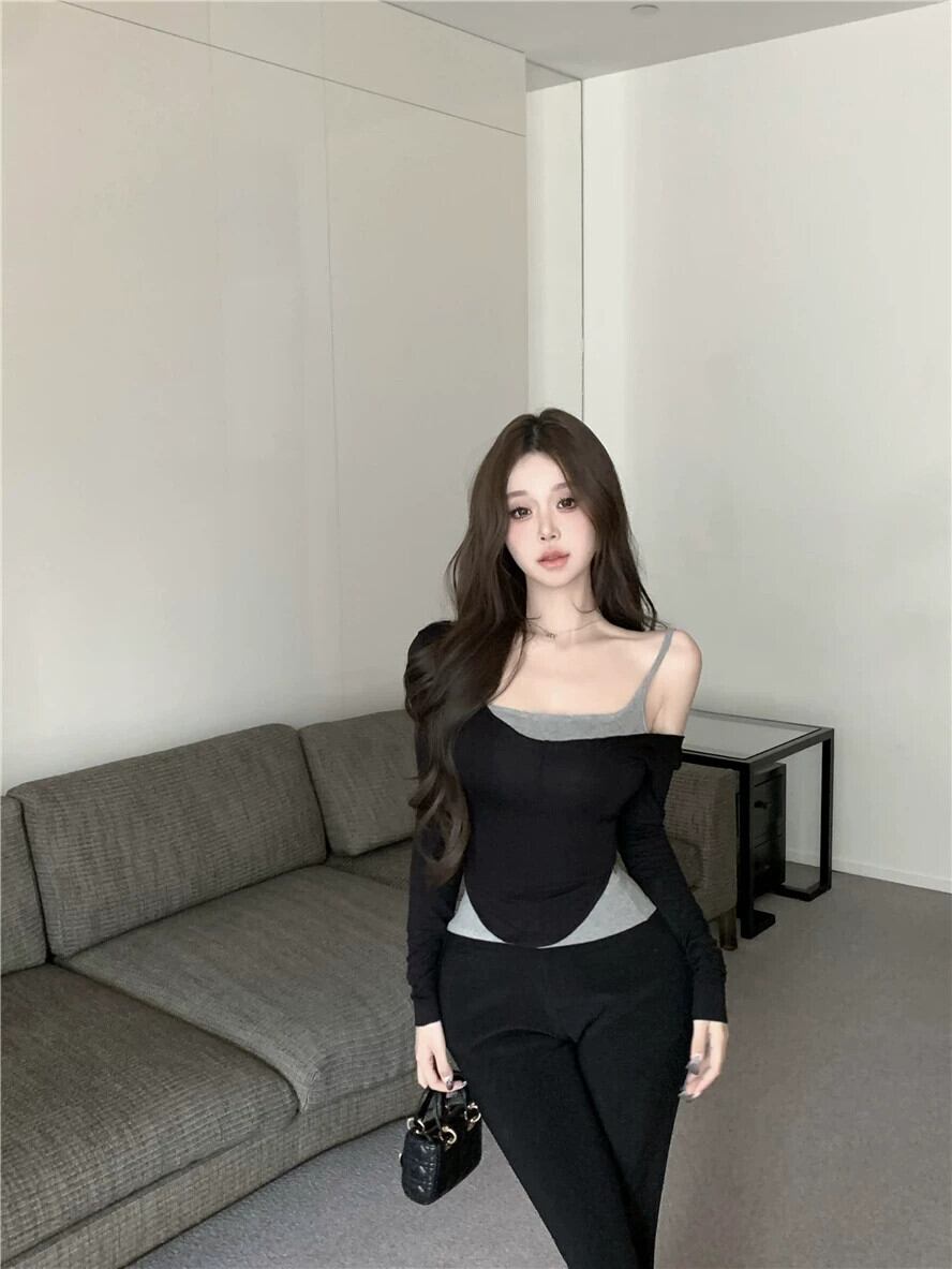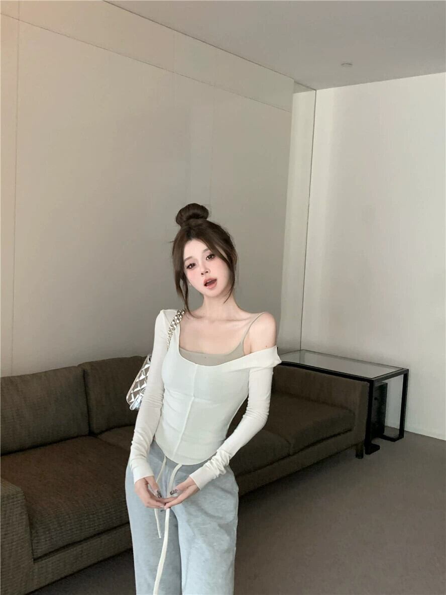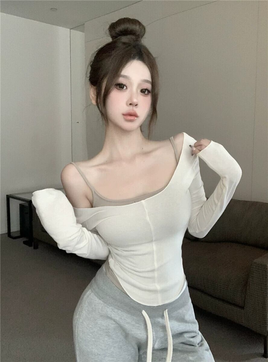 純粋な欲望スタイルタイトフィットバスト表示ビッグ U ネックトップ女性 2024 春の新しいボトリングシャツ湾曲した裾長袖 T シャツ ロング スプリング 春物 Tシャツ 857163329956260