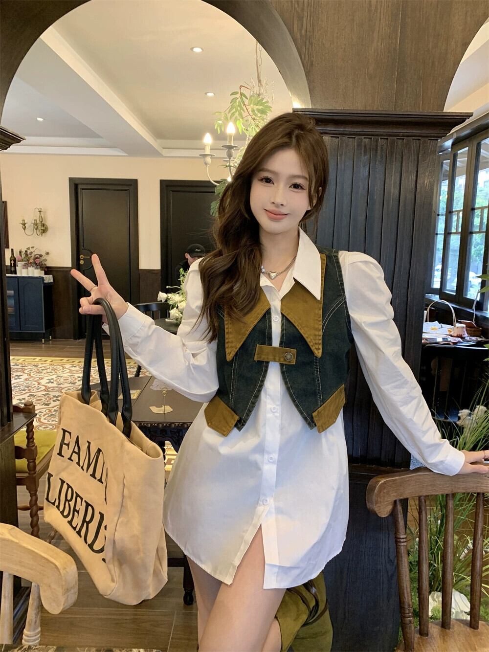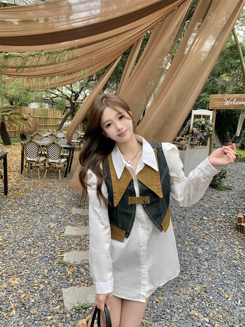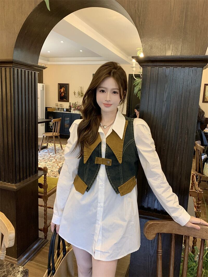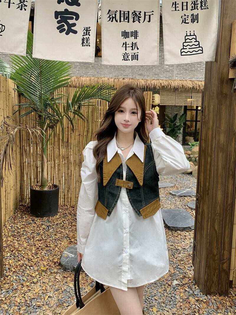 色:白シャツ+デニムベスト,白いシャツのワンピース