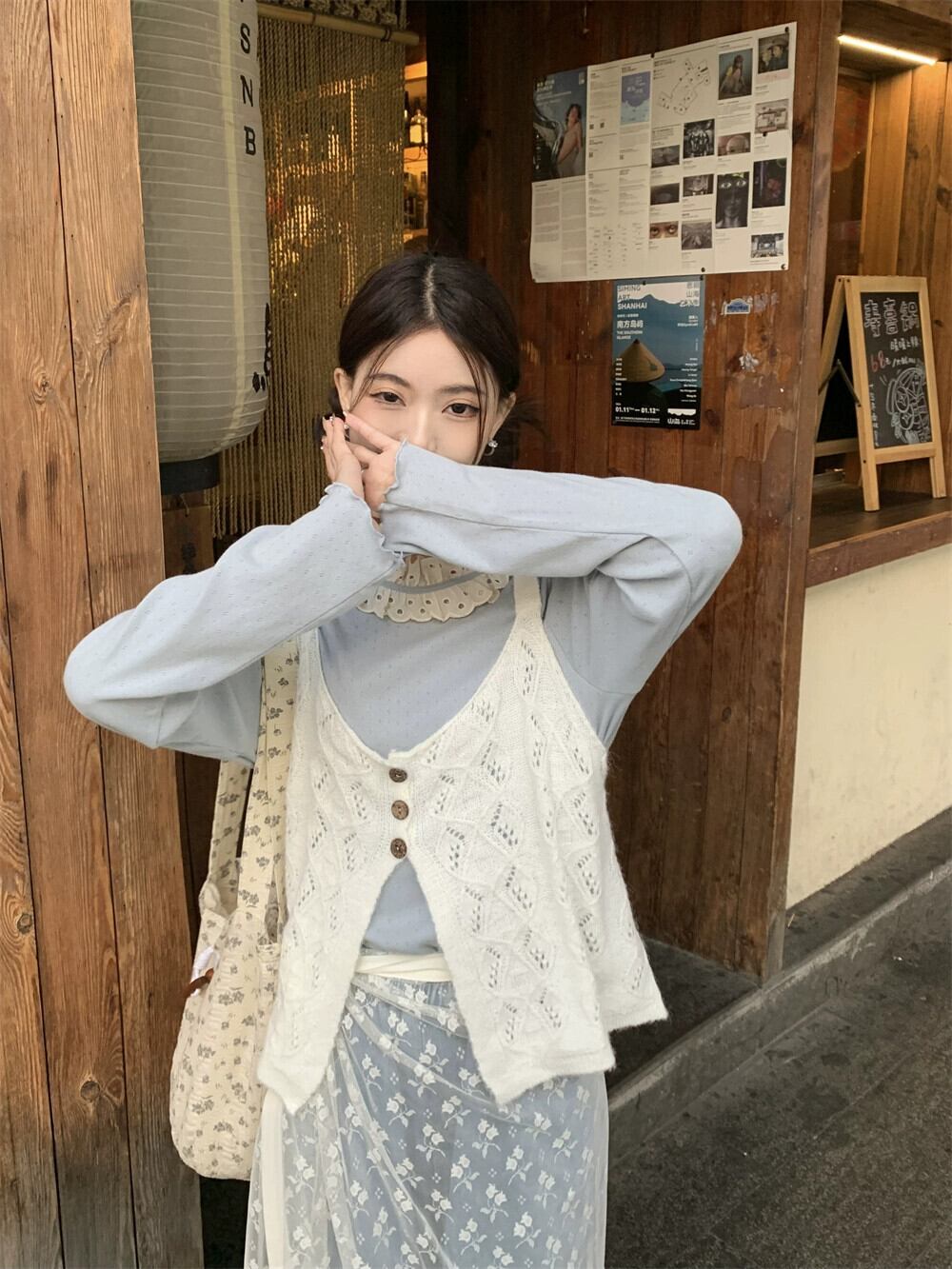 色:青いボトミングシャツ,ニットカーディガン,メッシュエプロン