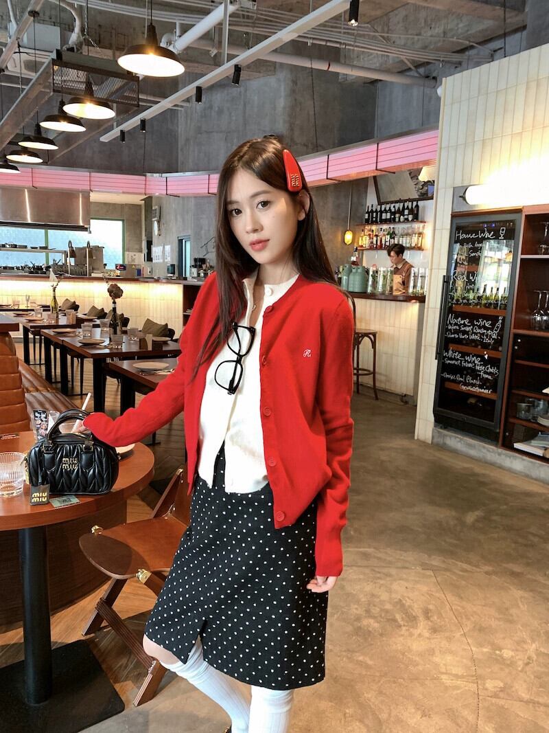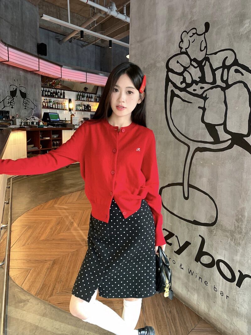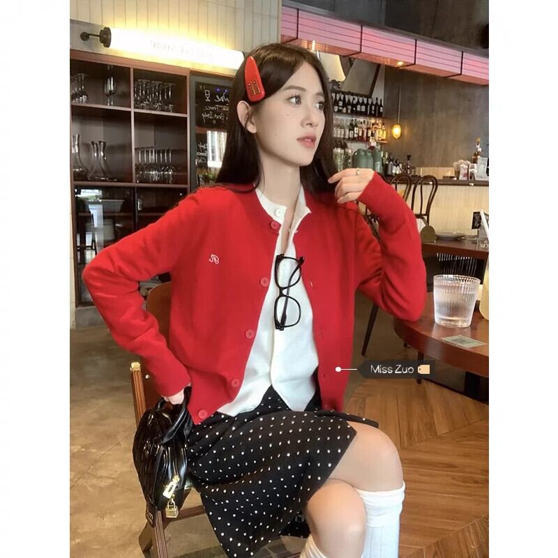 赤いショートラウンドネックセータージャケット女性春 2024 新しいハイエンドニットカーディガンソフトワックストップ レッド スプリング 春物 Oネック 8571685336118947