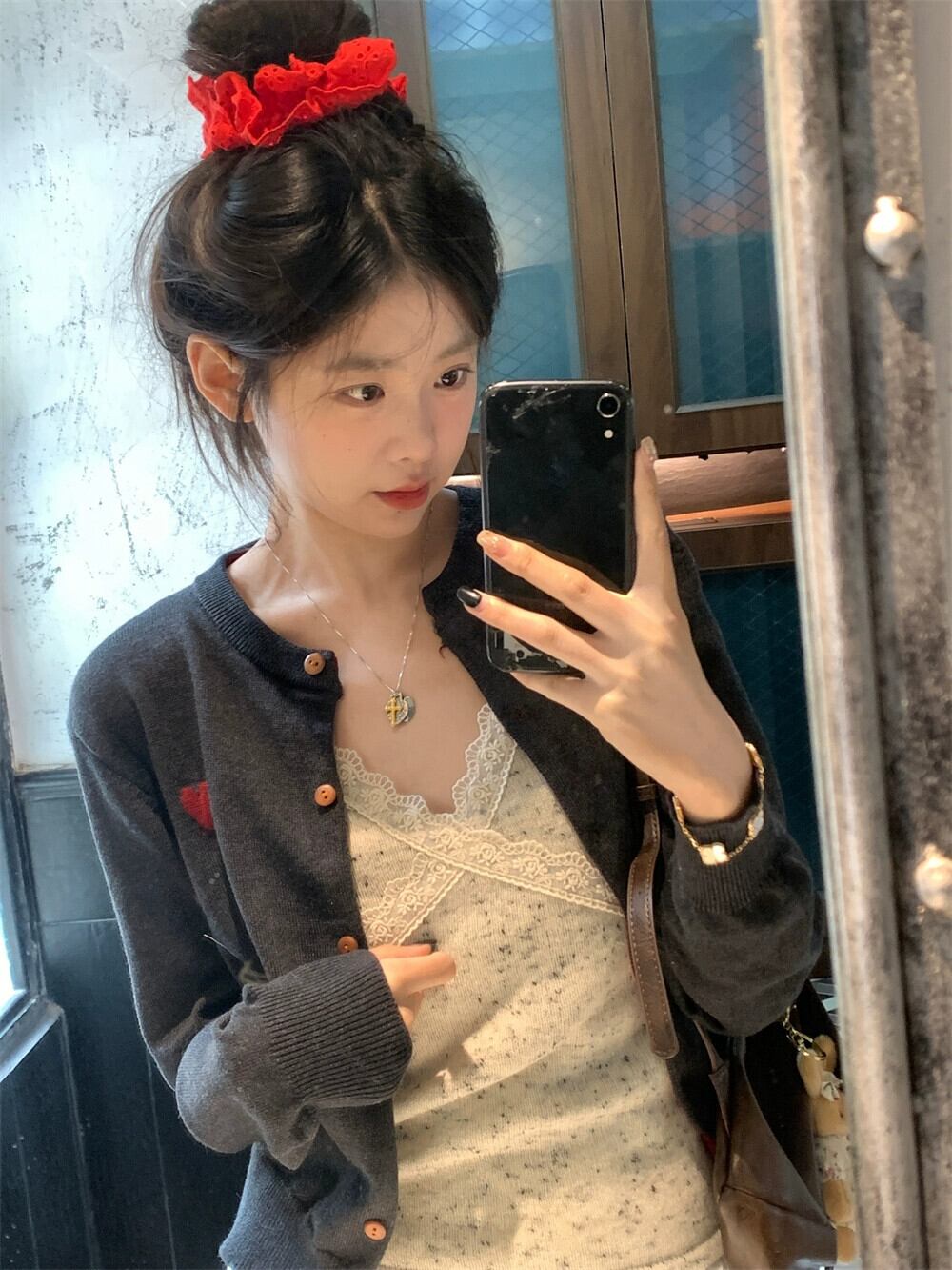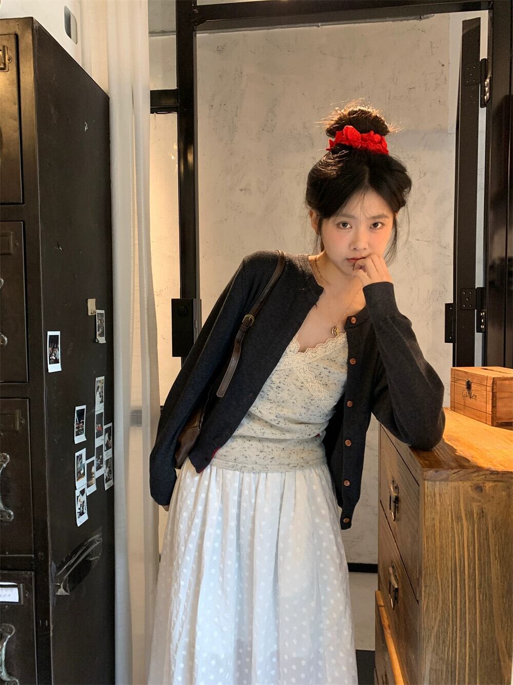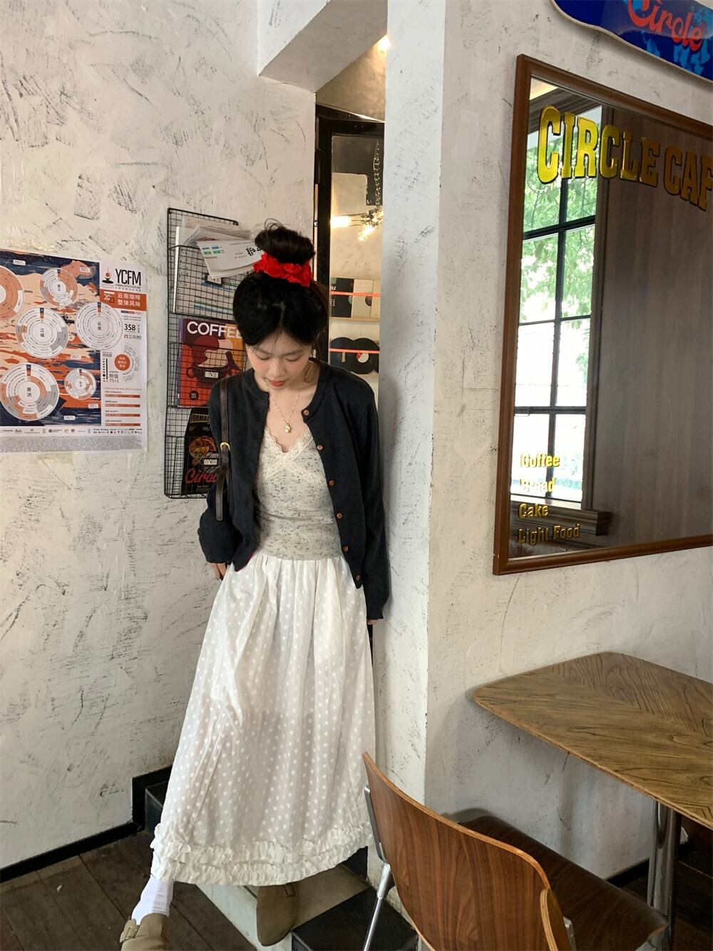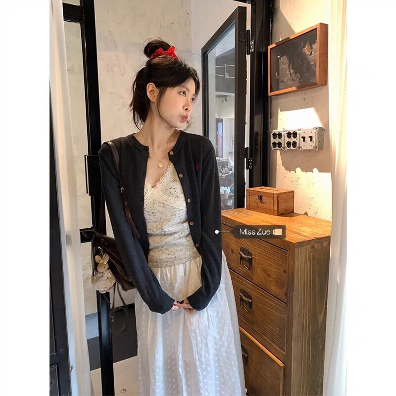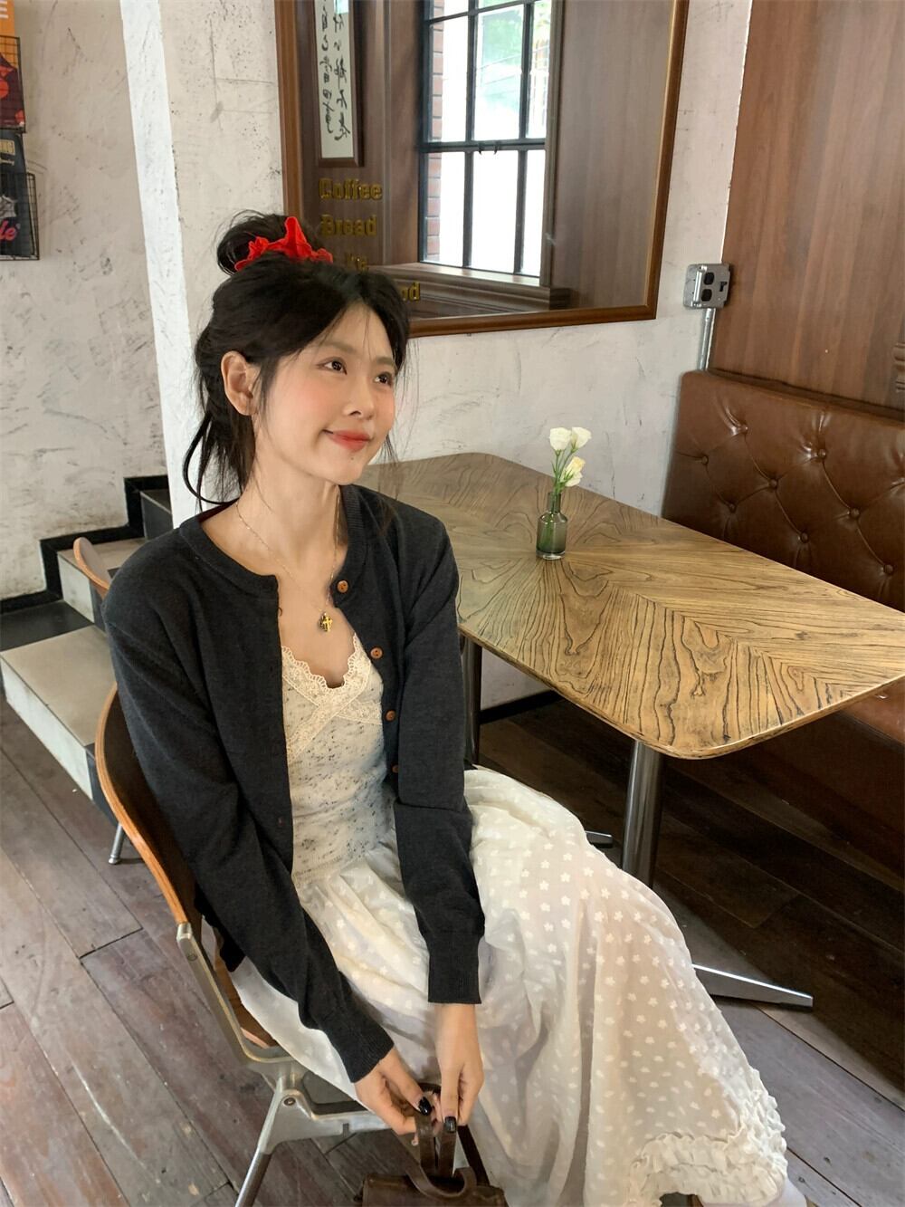 色:スリング,グレーのカーディガン,白いスカート