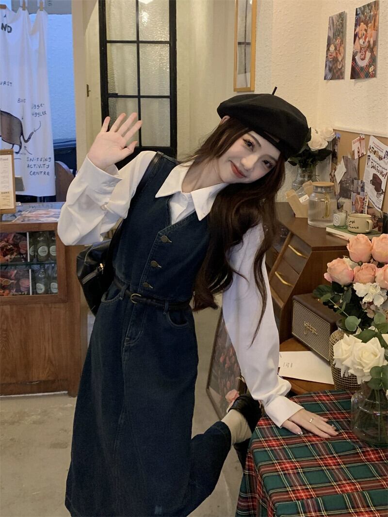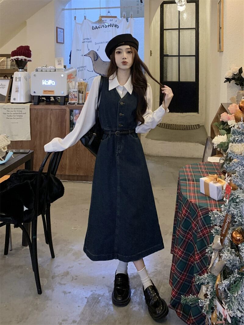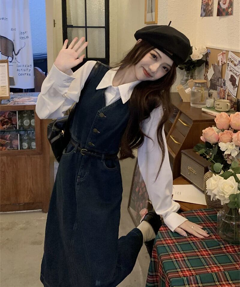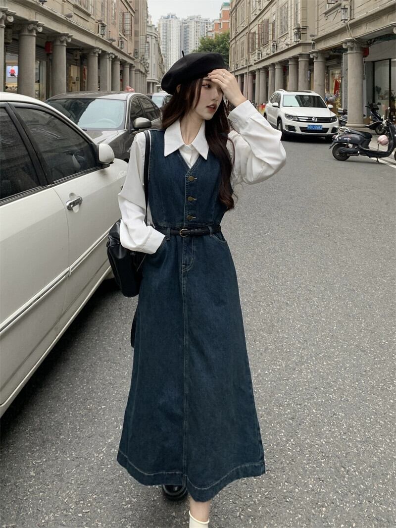 デニムサスペンダードレス女性 2024 初秋の新スタイル今年の人気トレンドシックなウエスト痩身ロングスカート オータム 秋物 8571625427655256