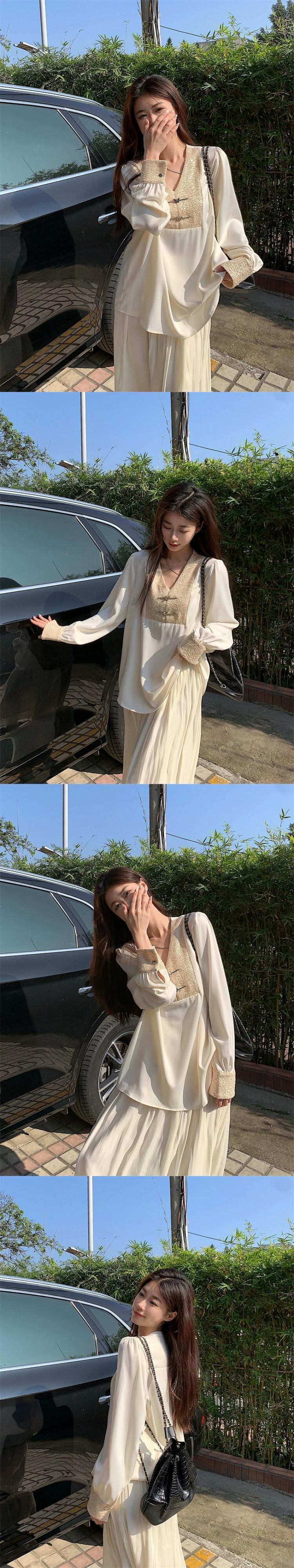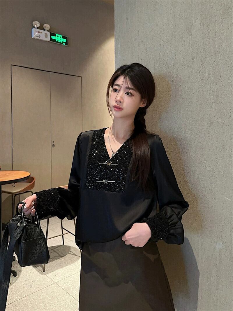 V ネック弓プレートボタンスパンコールシャツ女性の春の新中国風のスプライシング長袖オールマッチシャツトップ ロング リボン スプリング 春物 Vネック 8571627102197180