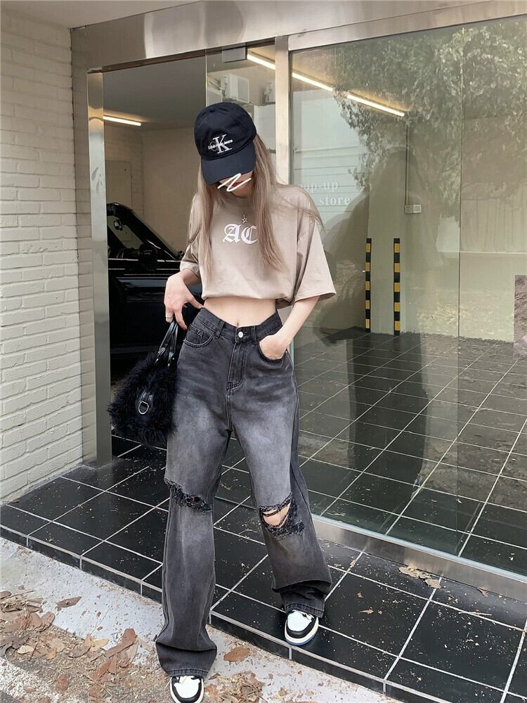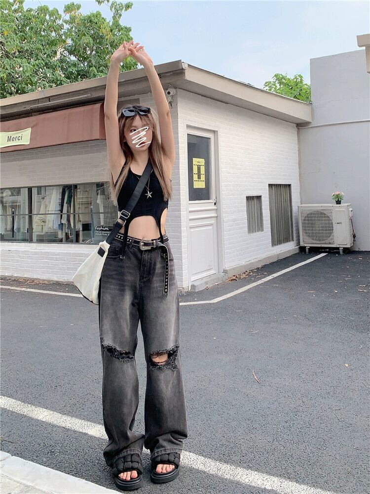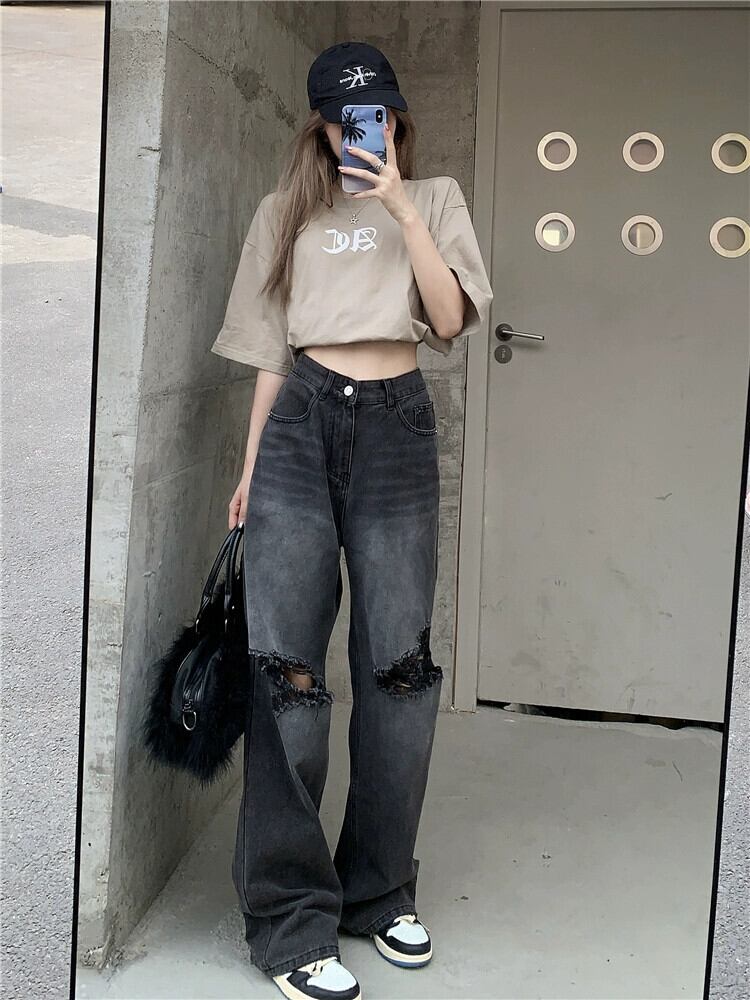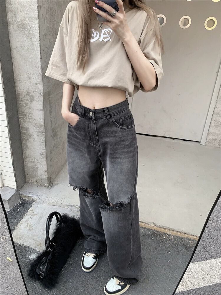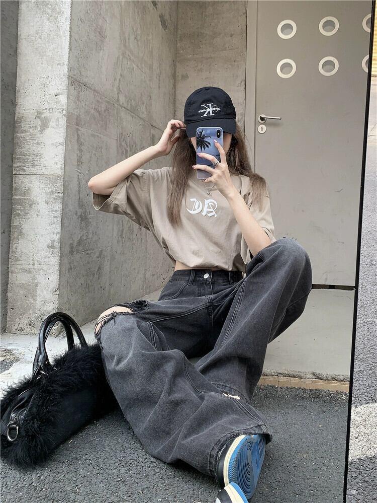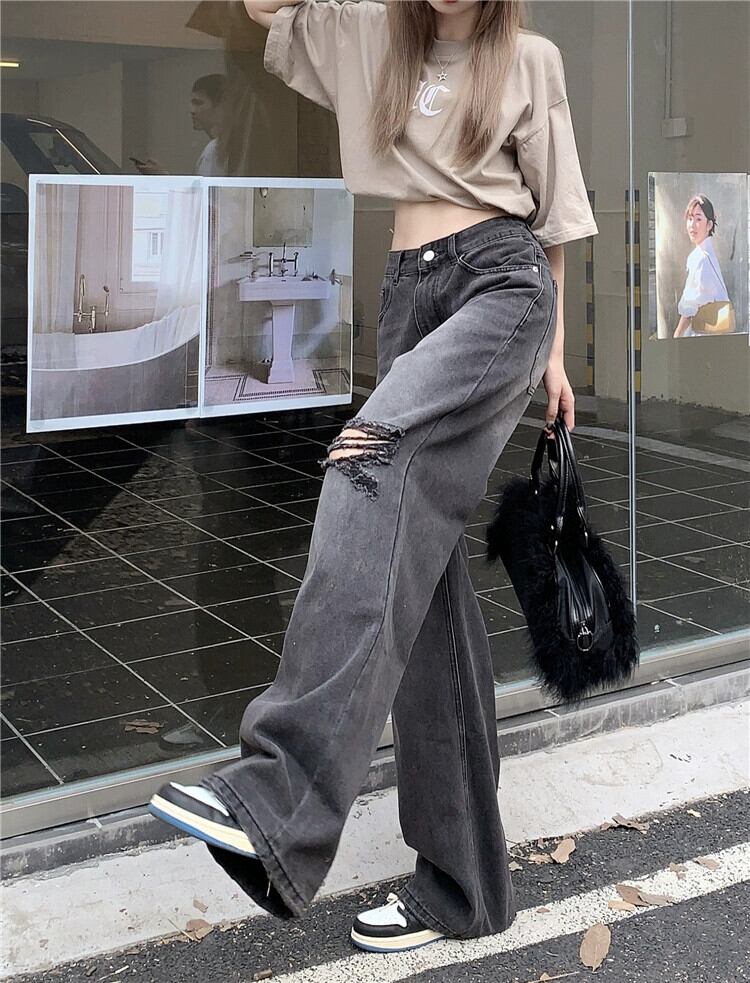 リップドジーンズレディースルーズストレート秋デザインニッチアメリカンレトロハイストリートフロアレングスワイドレッグロングパンツ オータム 秋物 8571638467752443