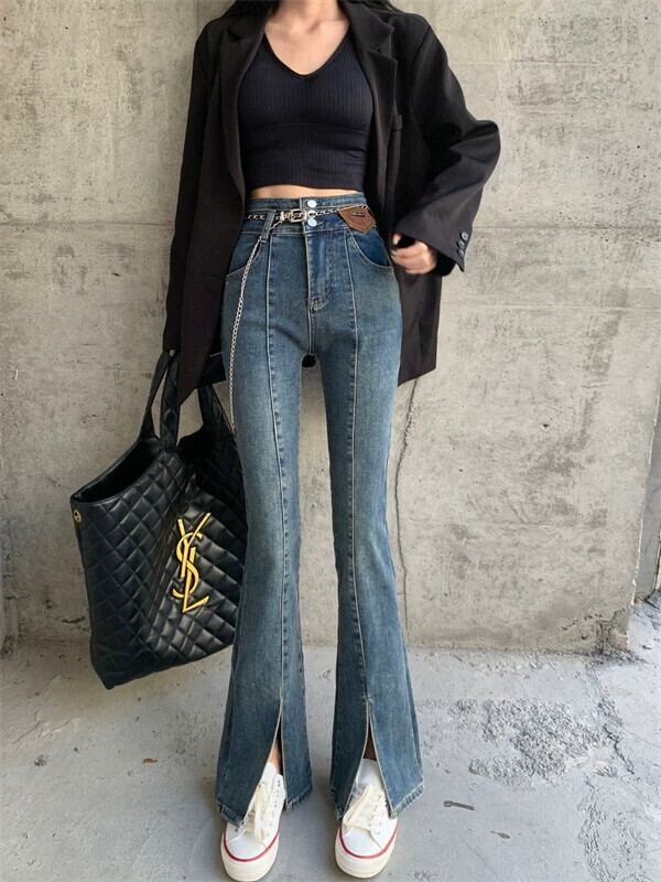 マイクロフレアジーンズレディース、ニッチデザイン、2024秋の新しいスタイル、ハイウエスト、スリムフィット、スリットフロアレングスパンツ レッド オータム 秋物 8571618005998612