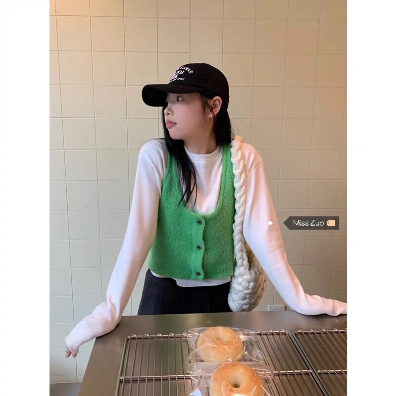 ズオ先生が来ました~ 甘くて万能なボタン付きサスペンダーベスト+白の長袖ストレッチセーター ロング ホワイト 大人ガーリー スウィート キュート カジュアル 8571647177672103
