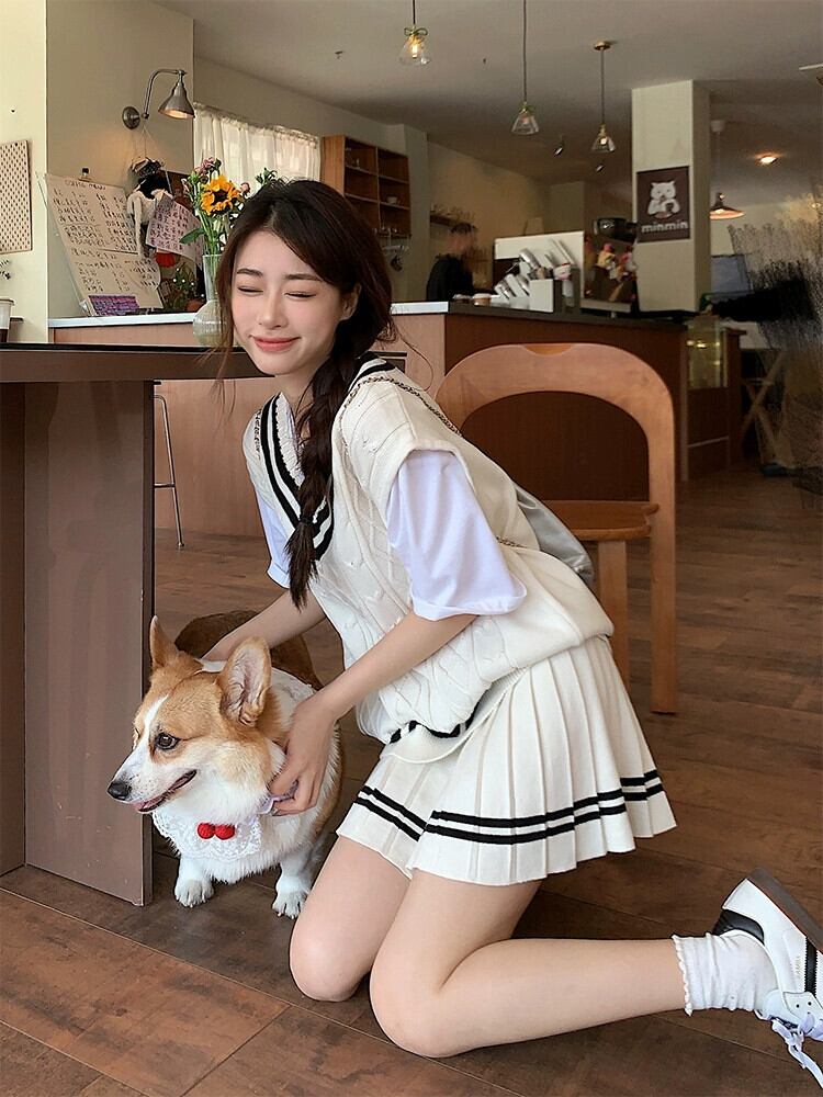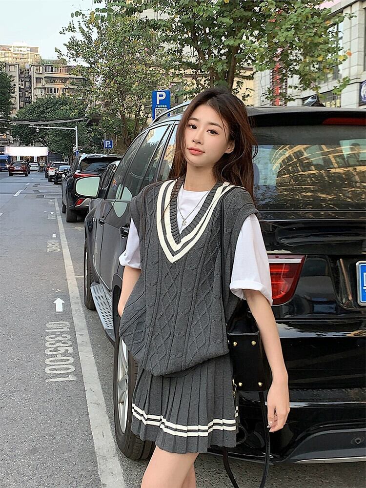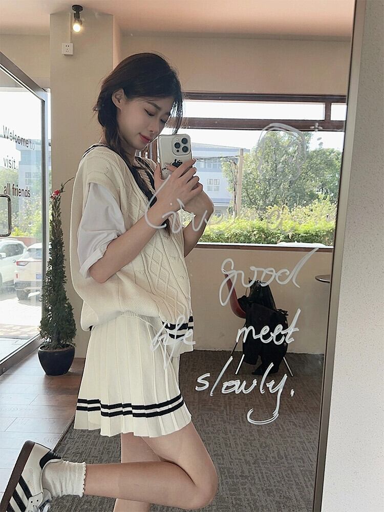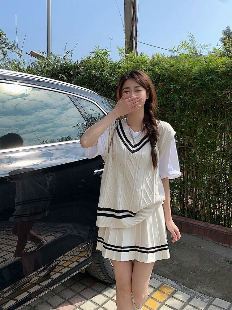 V ネックニットベスト女性夏 2024 新しいカレッジスタイルコントラストカラースタックセーターベストトップ サマー 夏物 Vネック 8571626113845377