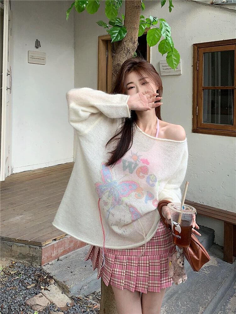 色:ピンクチューブトップ,ピンクプリーツスカート,ベージュのセーター