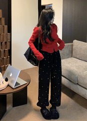 重工業のダイヤモンドがちりばめられたワイドレッグパンツの女性の 2024 年春の新しいハイエンドのルーズで小さなハイウエストのドローストリング ストレート パンツ スプリング 春物 8571675340272504