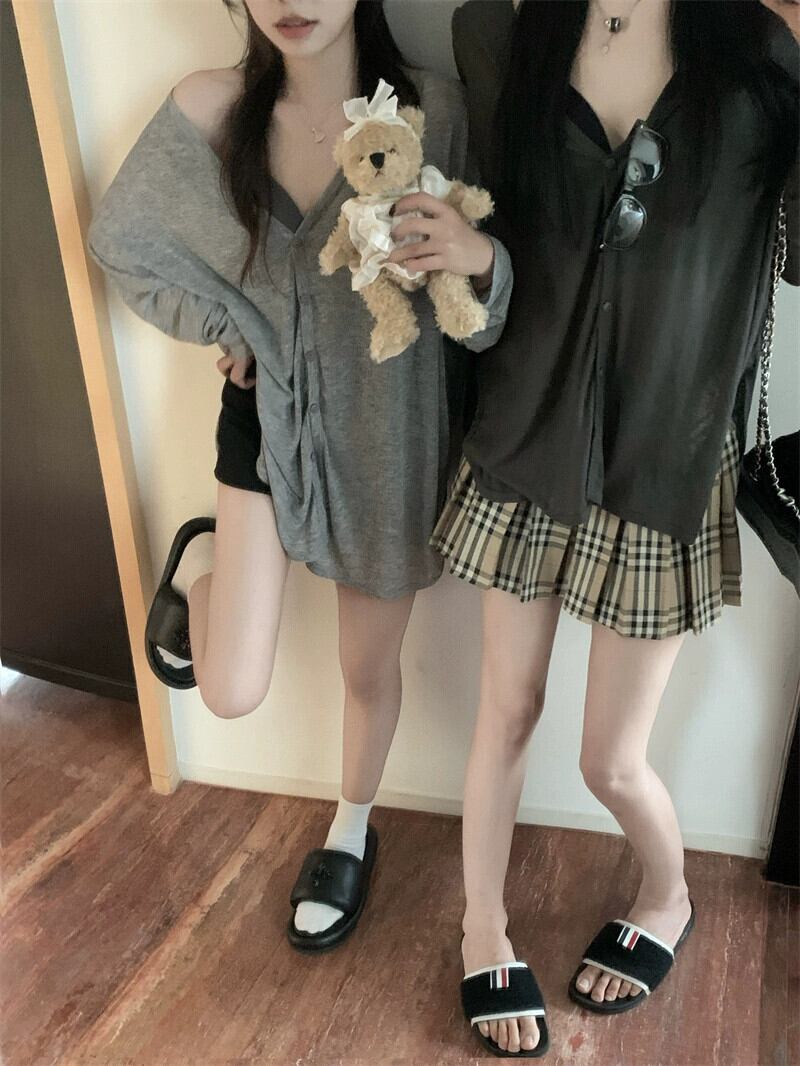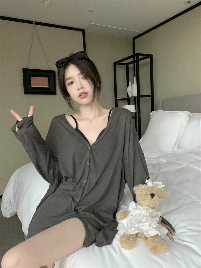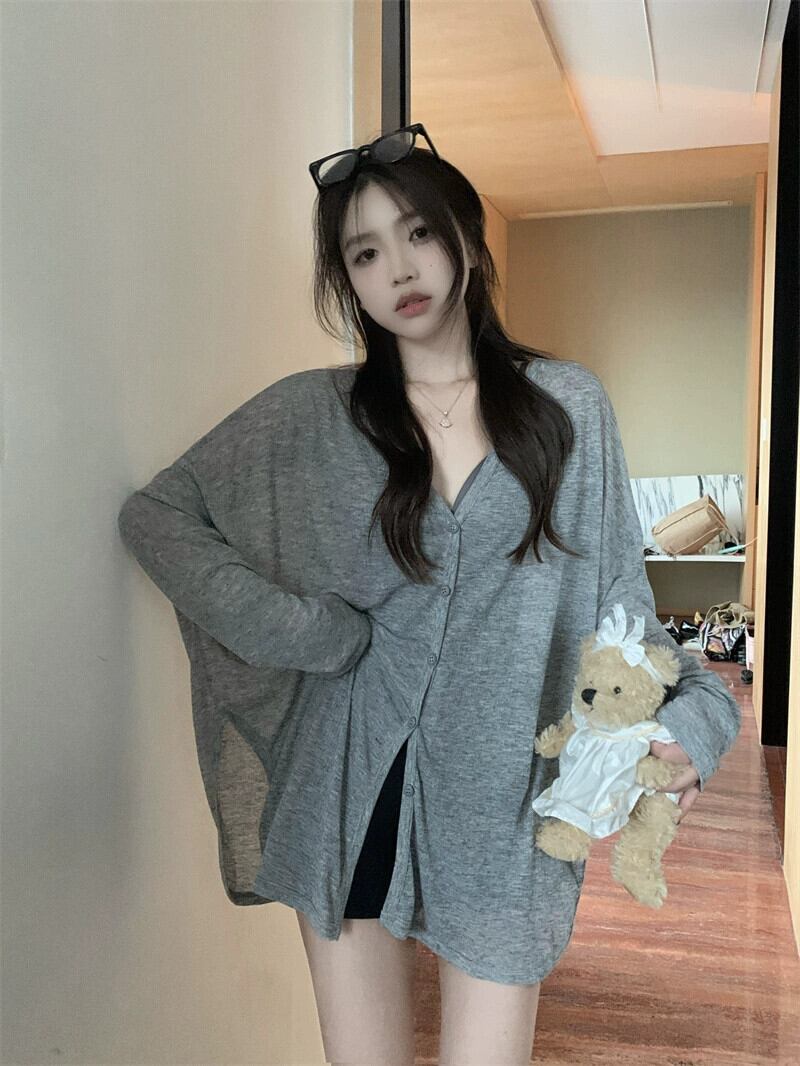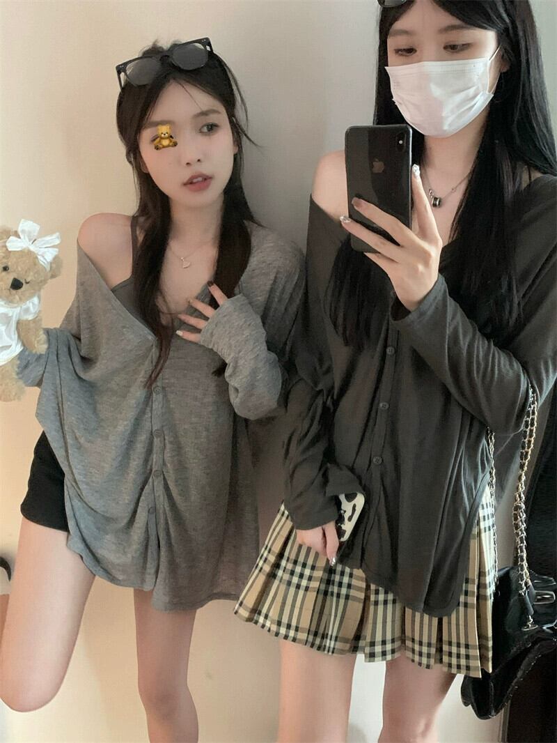ダークグレー日焼け止め長袖 Tシャツ女性秋 2024 新デザインニッチ甘いルーズ痩身トップ ロング 大人ガーリー スウィート キュート カジュアル オータム 秋物 8571634321794929